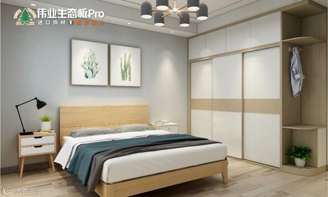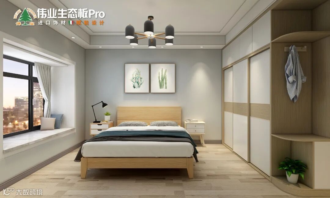 主卧是灰调的墙壁+原木风的家具,三趟门式的衣柜把一切衣物收入其中,床头背景墙巧用挂画,解决“大而空”的问题,增加绿植、筒灯,整体理性静谧、优雅柔美。