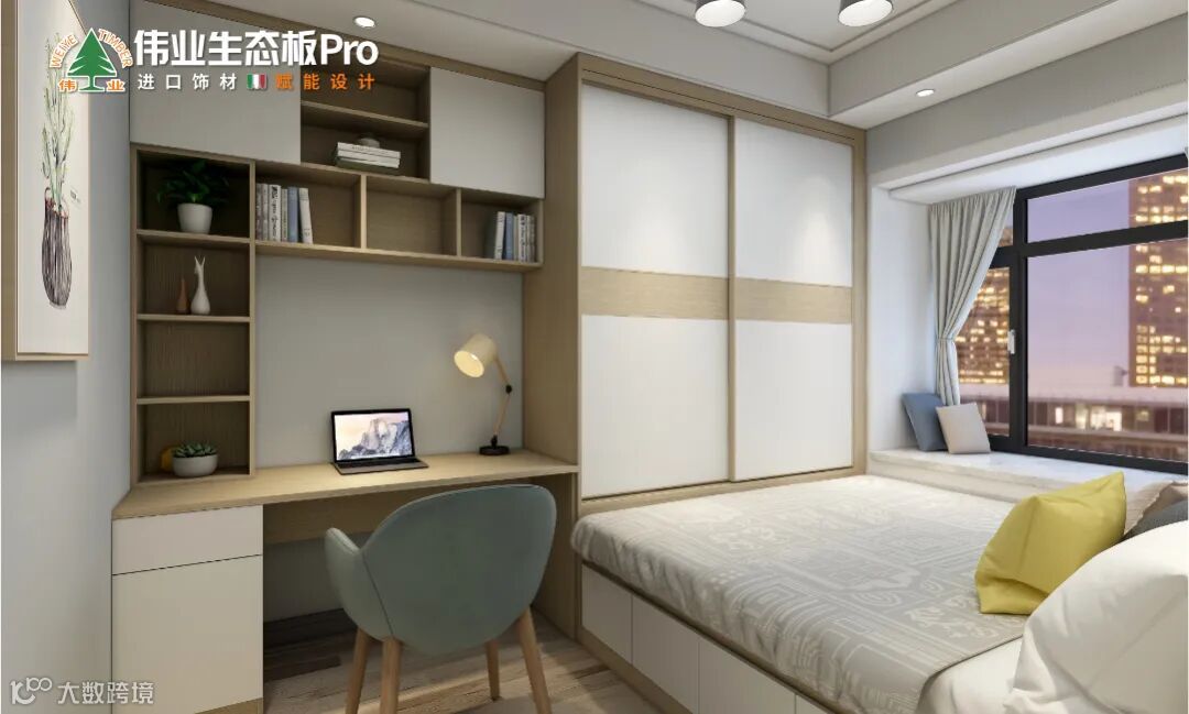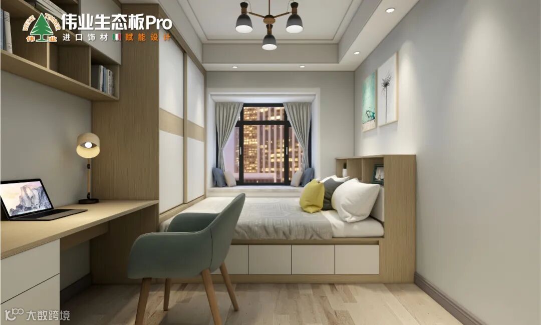 小次卧设计成一体化榻榻米,榻榻米+书柜+衣柜+学习台,功能叠加翻倍,休闲娱乐、临时客卧、储物室、儿童房等统统hold住,在有限的面积内实现更多功能,让次卧真正实用起来。