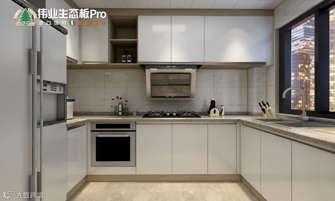 厨房基于U型的设计布局,以优雅的白色为主,橱柜的造型简洁利落,和灰色的大理石台面、白色的墙砖完美契合,同时上下吊柜创造了巨大收纳空间,让厨房不再杂乱,规整又干净。