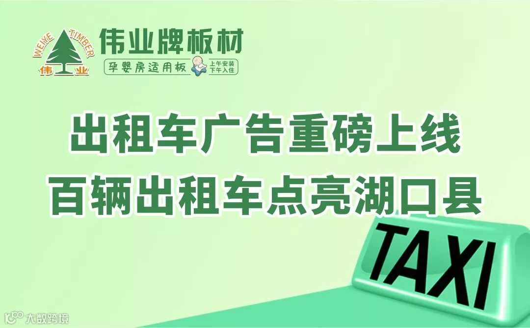近日,伟业牌板材湖口地区新一轮户外广告再度来袭,百辆出租车搭载着醒目大气的品牌广告,共同点亮湖口县,借助出租车流动量大、覆盖面广、营运时间长的特性,全面加深品牌推广深度。