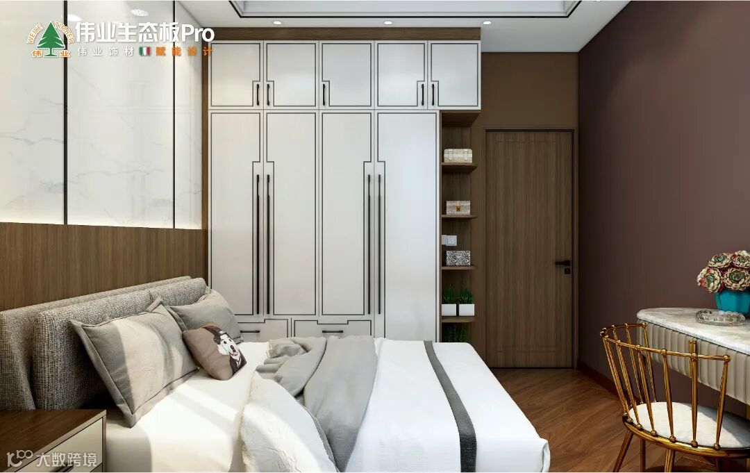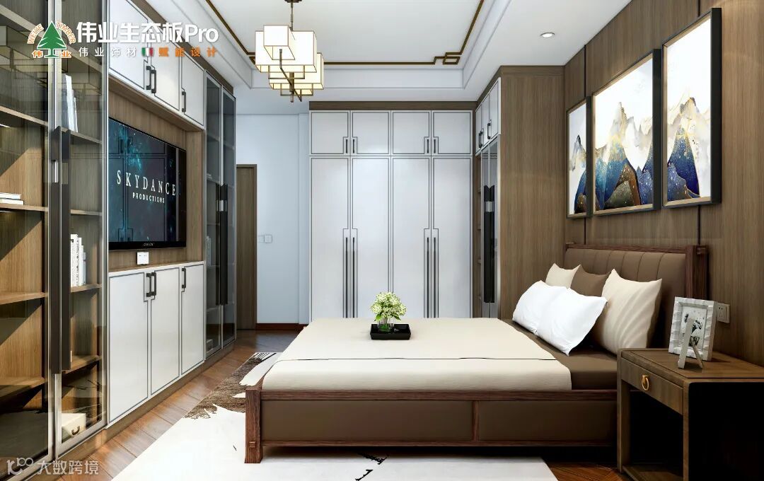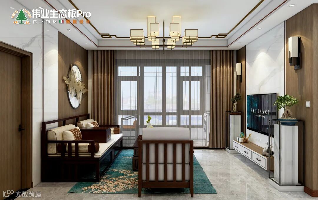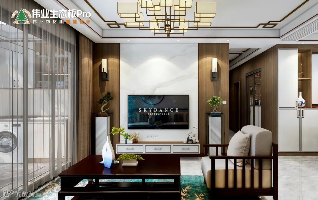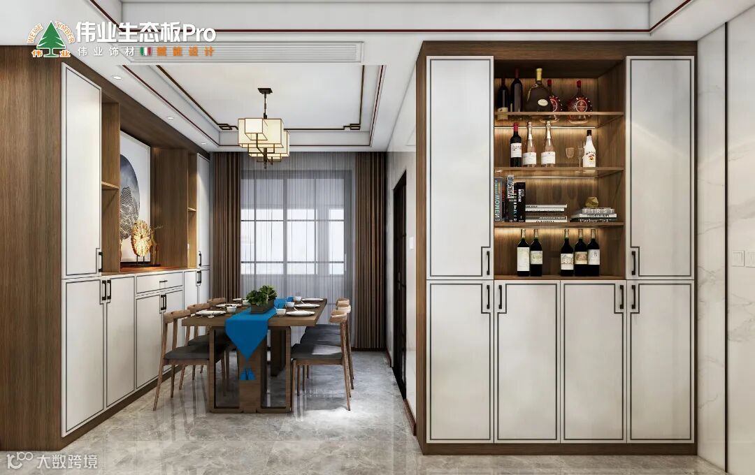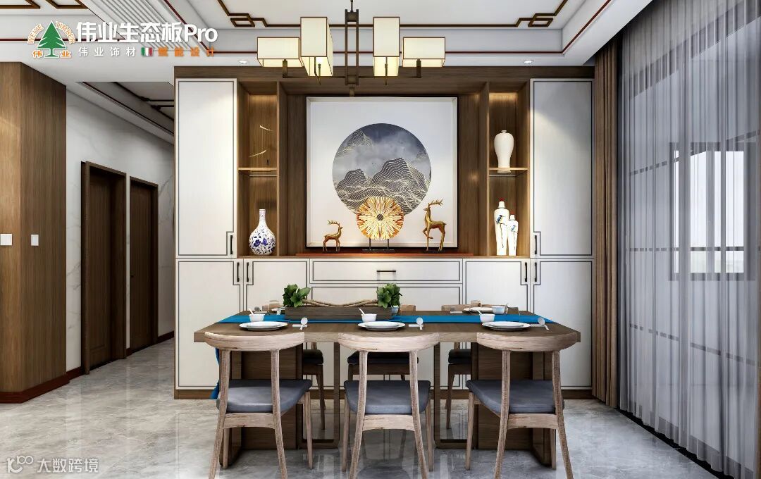 设计说明:新中式将中式经典元素加以提炼,结合现代审美,以伟业生态板Pro的D102春雨江南、211麻石白-火烧、213大理白-火烧为主色调,为家打造淡而雅、简而精的高级格调。