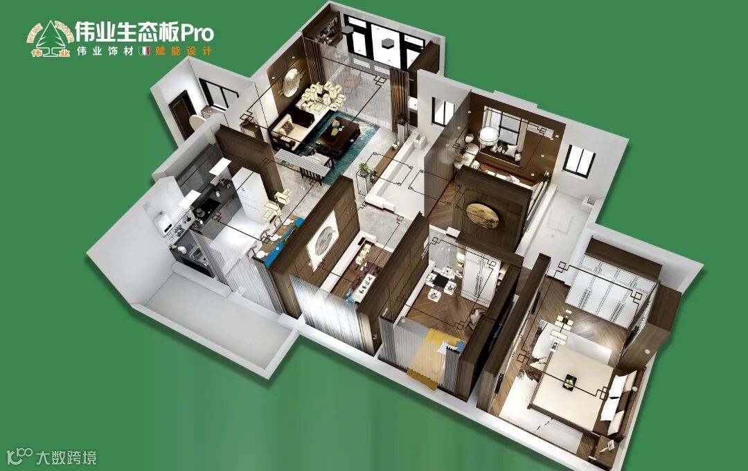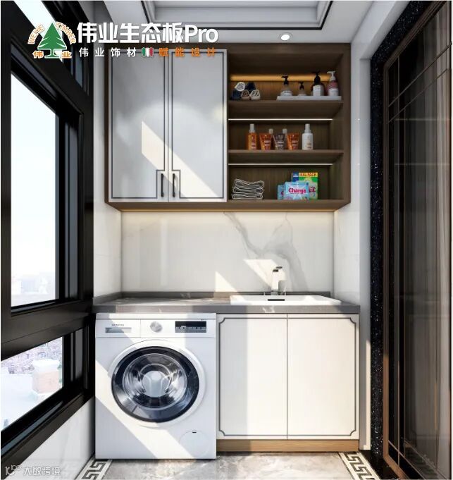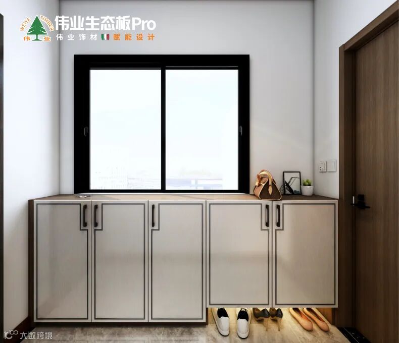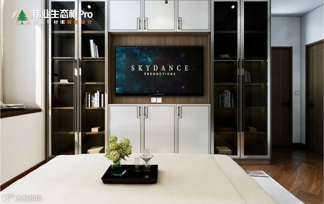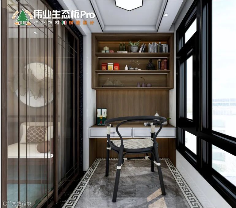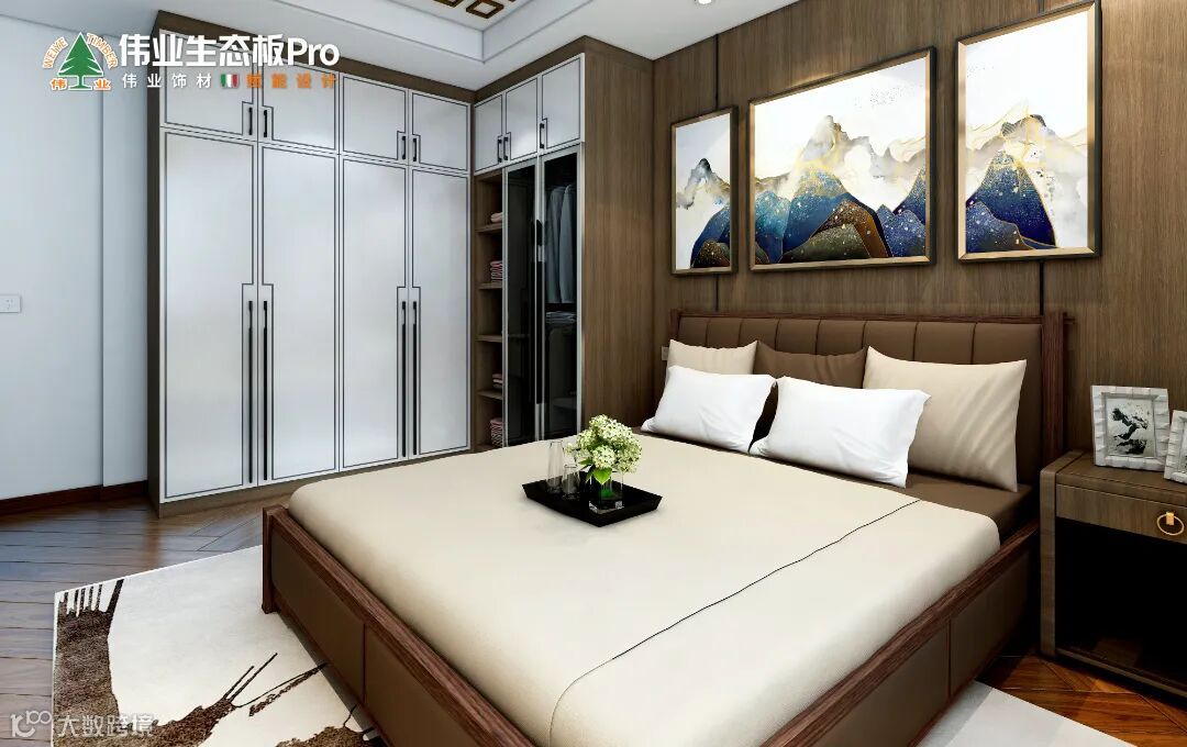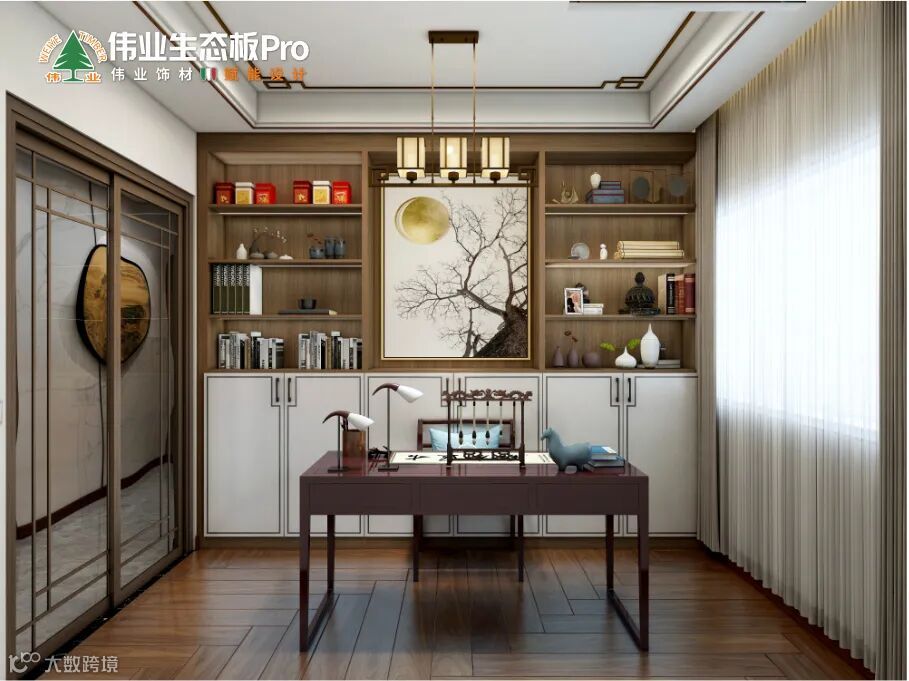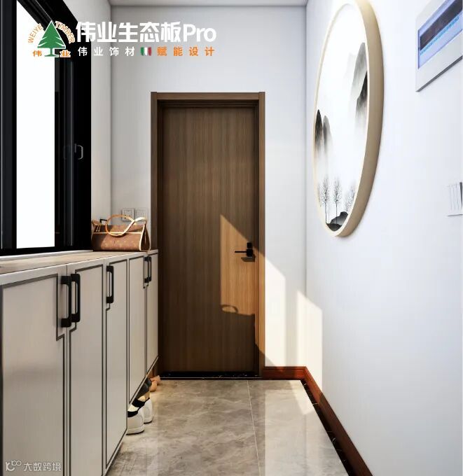 设计说明:新中式将中式经典元素加以提炼,结合现代审美,以伟业生态板Pro的D102春雨江南、211麻石白-火烧、213大理白-火烧为主色调,为家打造淡而雅、简而精的高级格调。