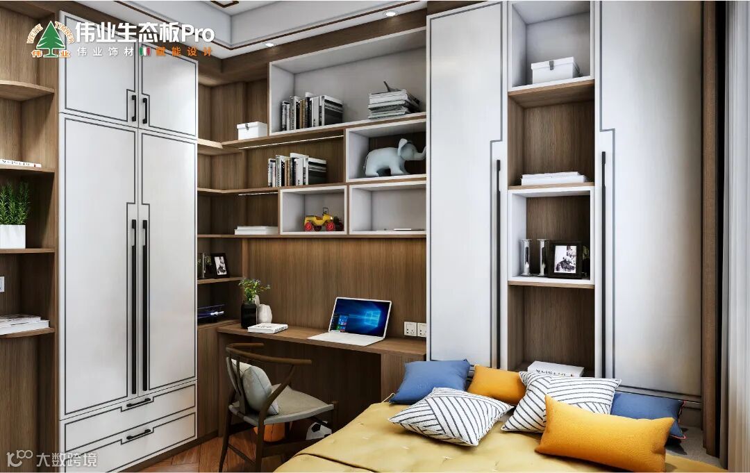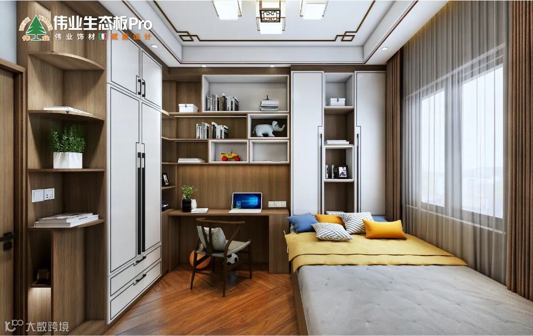 儿童房采用衣柜+书柜+榻榻米一体化设计,D102春雨江南、211麻石白-火烧为主色调,实木的桌椅、中式的灯饰、金色的挂饰,让中式元素与现代元素融合,集收纳、展示、学习、休息于一体,高效利用空间,具备很强的实用性和观赏性。