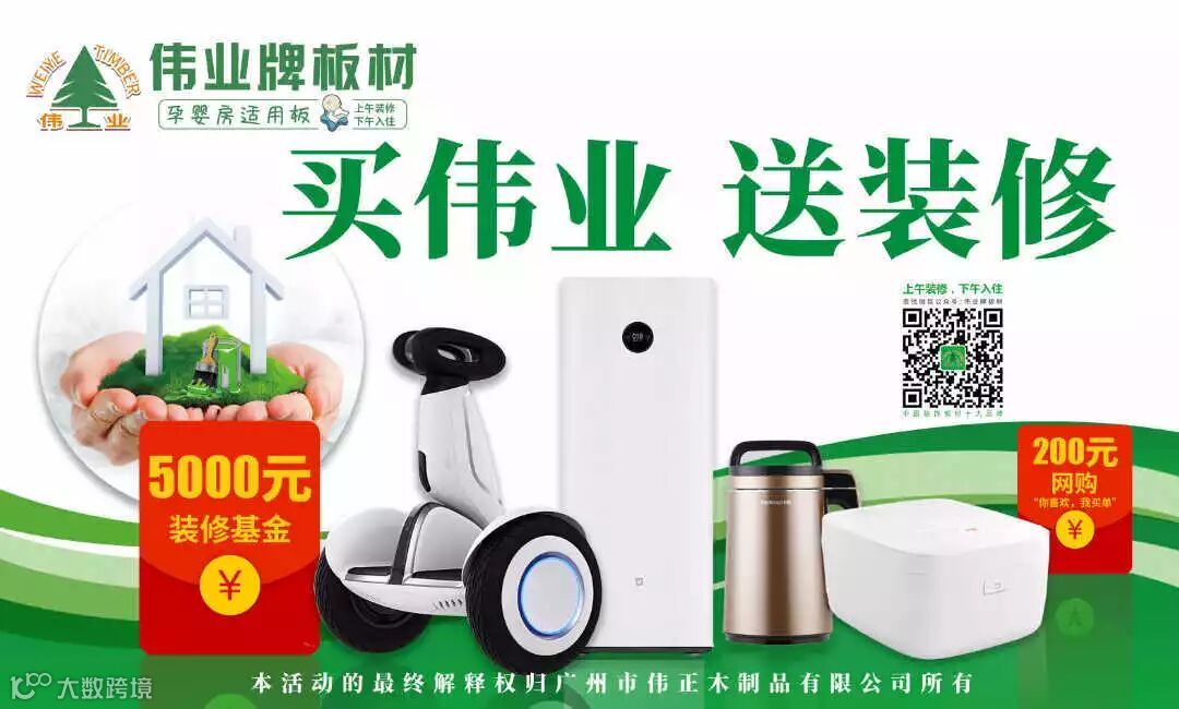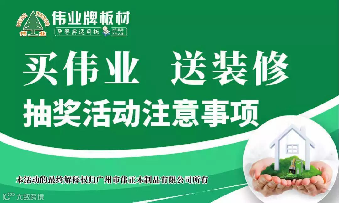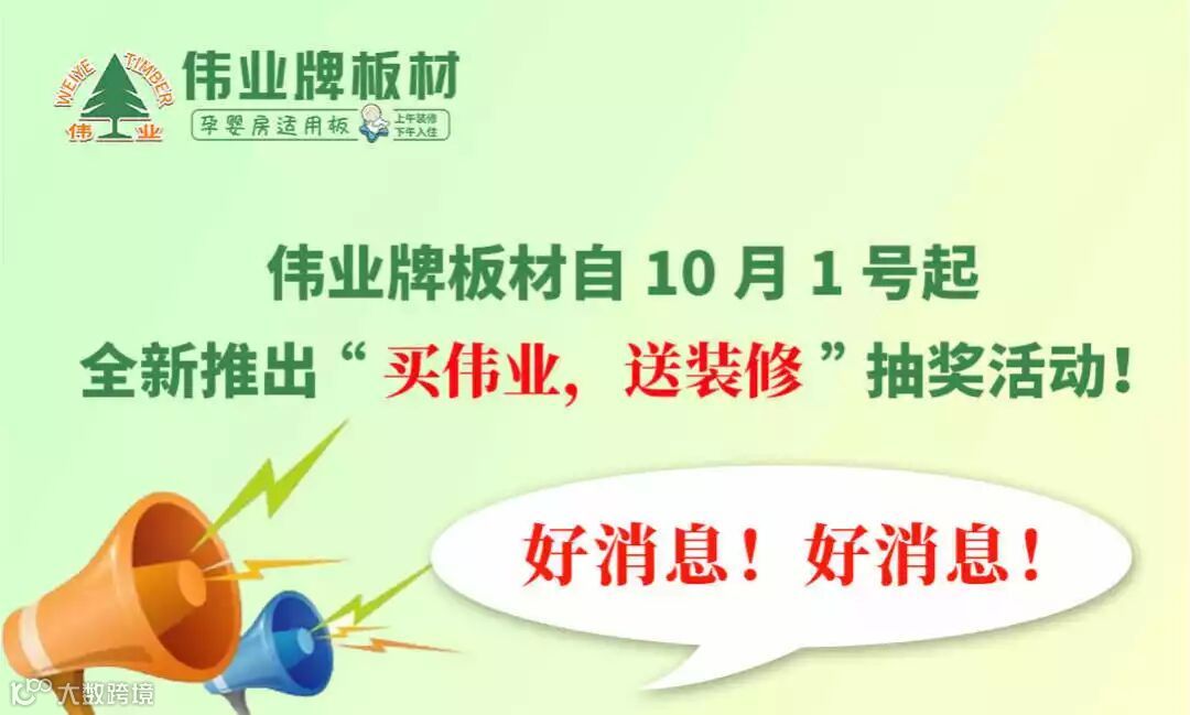 好消息!好消息!伟业牌板材自10月起,全新推出“买伟业,送装修”抽奖活动!凡是购买伟业牌板材系列产品的消费者,均有可能获得装修基金!