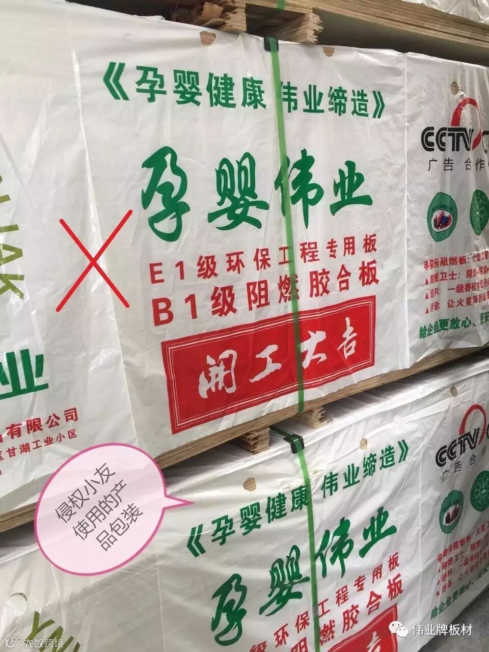 我司的孕婴房适用板系列是2013年开始推出并大力推广的,自推出起全部的胶合板、大芯板和生态板都是使用这类型的包装袋。除了这几类板材,我们还出售阻燃板、石膏板,而侵权小友所使用的包装袋很容易就会被认为是“伟业牌”的阻燃板包装,不得不说,在混淆消费者视线这方面,侵权小友的功力还是不容忽视的!小编第一眼看到时还以为我司的产品更换包装袋了....
