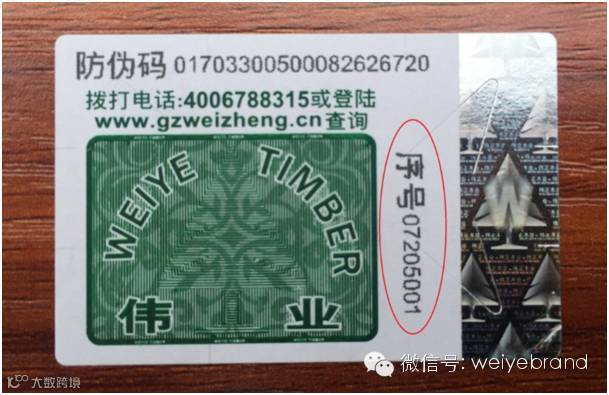②每一张正品“伟业牌”的板材都必然贴有防伪标贴(绿、蓝、红三色其一),上面会有一组由20位不按顺序排列的阿拉伯数字所组成的防伪码,您可以拨打全国唯一防伪热线“400-6788-315”进行查询;