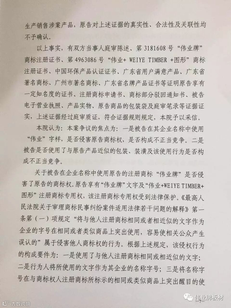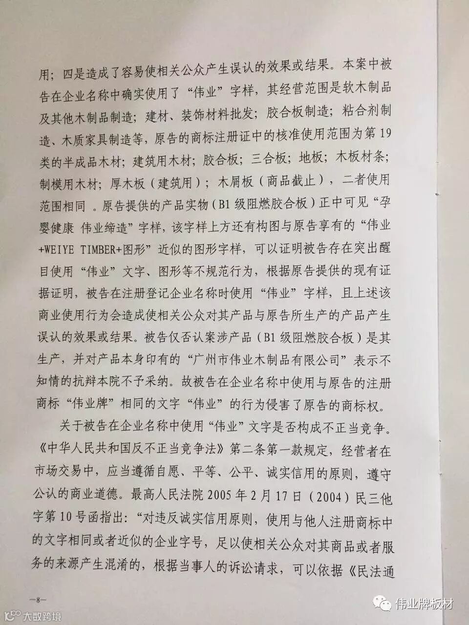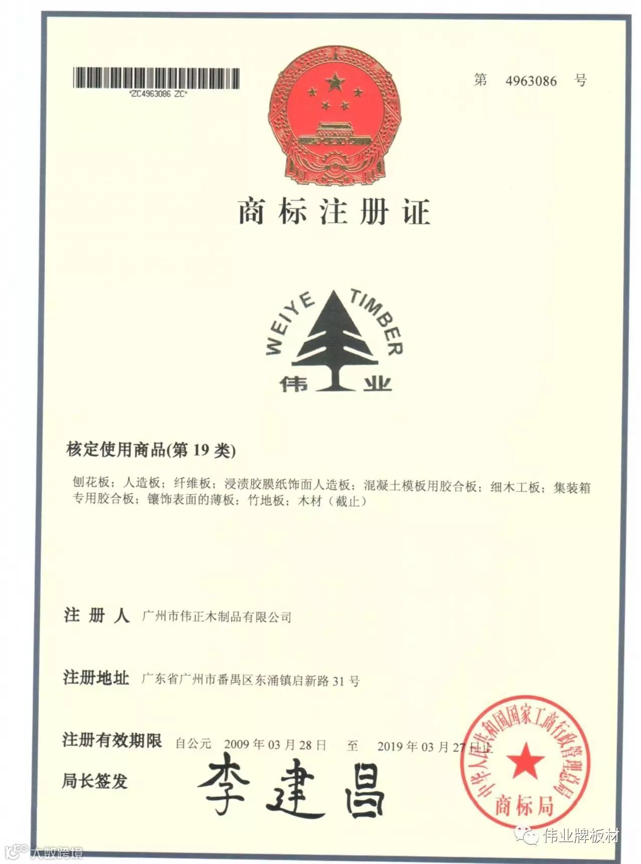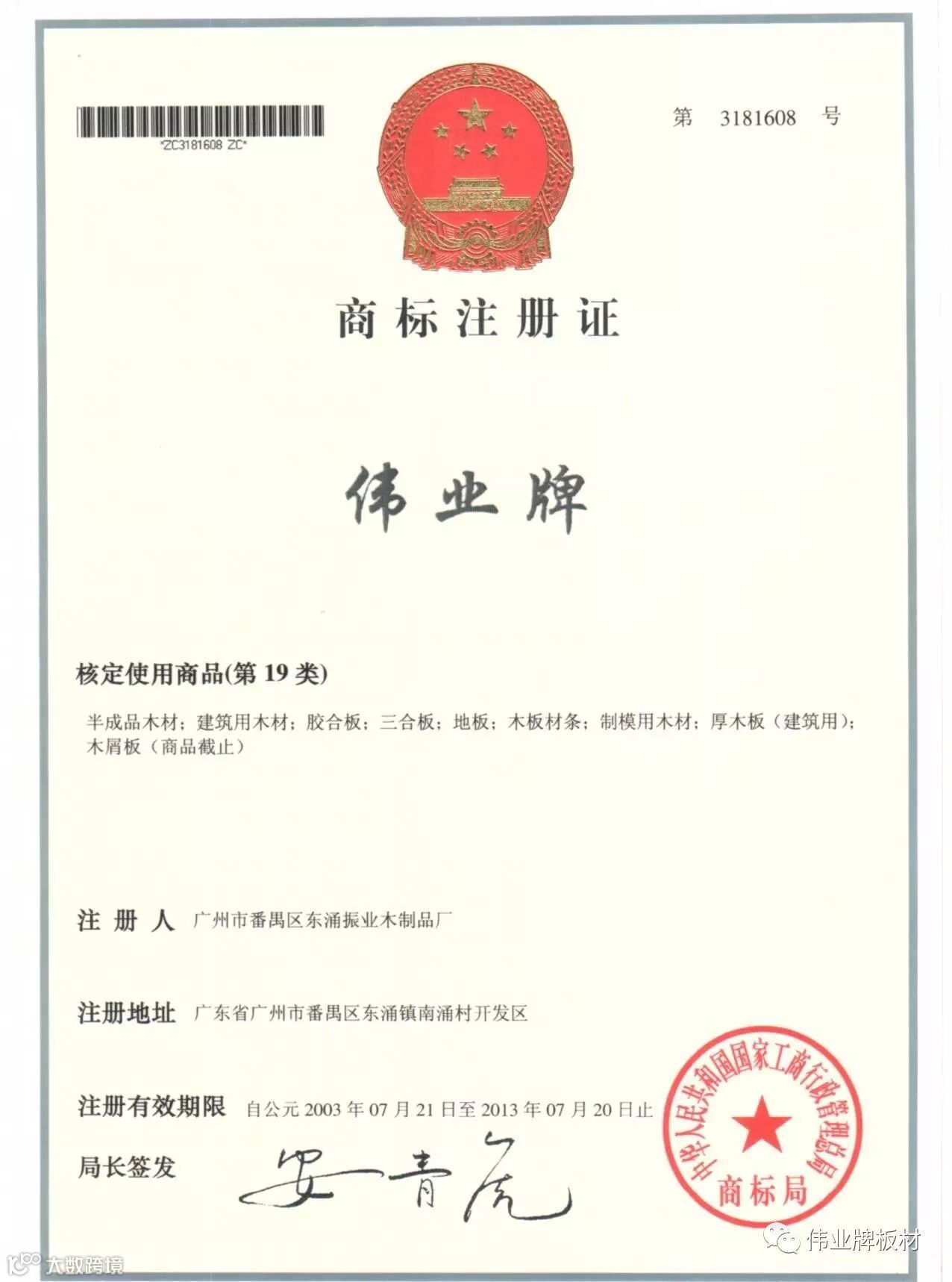 我司“广州市伟正木制品有限公司”成立于2002年,是一家专业生产抗甲醛环保装修板材的大型木制品企业,产品类别包括胶合板(夹板)、大芯板(细木工板)、生态板等。我司“伟业牌”商标在2003年得以核准注册,并于2009年取得“伟业+WEIYE TIMBER+图形”商标专用权。我司经过多年的艰苦奋斗和对商标的大力推广,现已取得不错的成绩,在相关公众中享有极高的美誉度,成为公众熟知的知名商标。