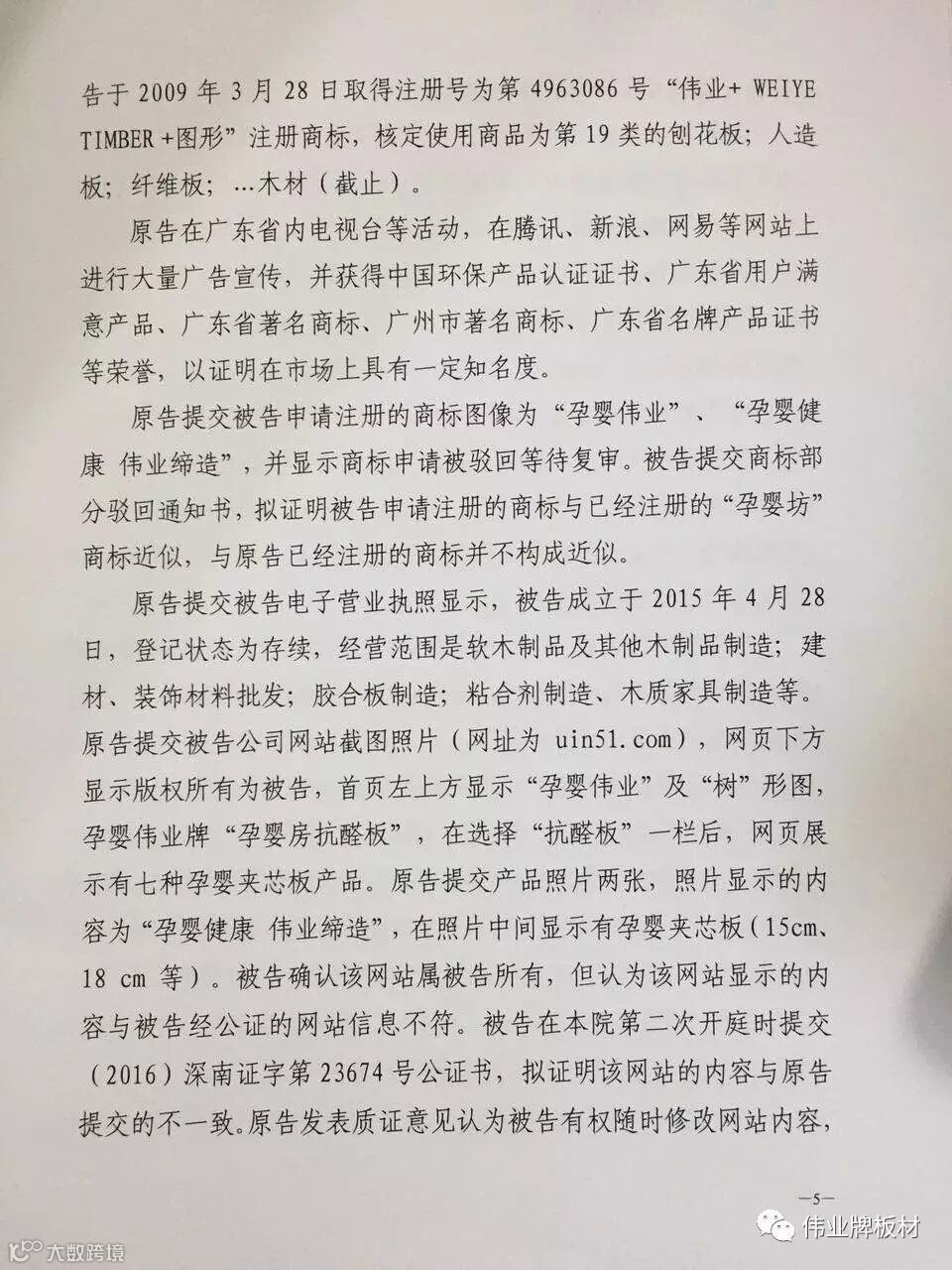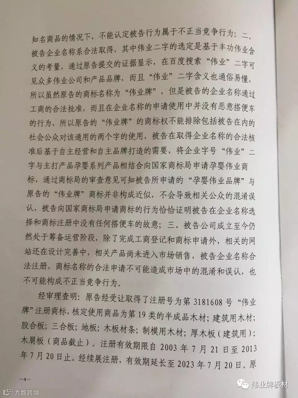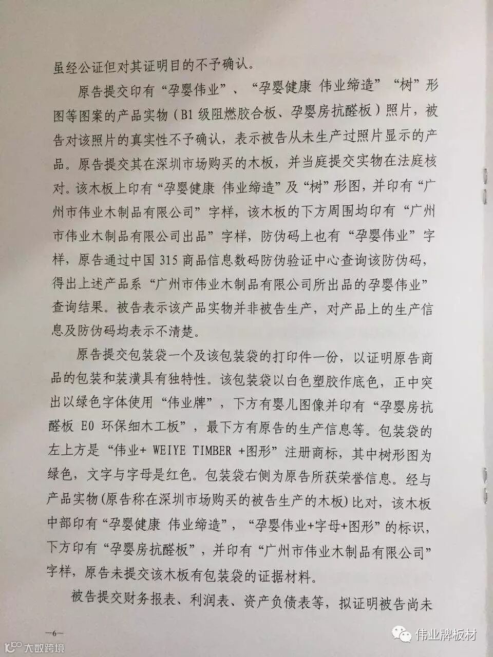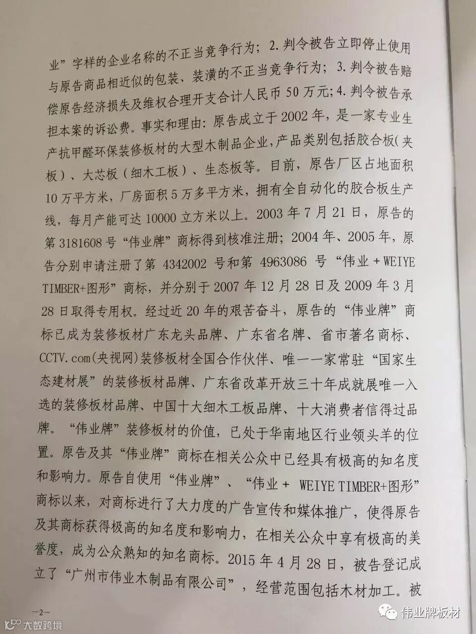 我司“广州市伟正木制品有限公司”成立于2002年,是一家专业生产抗甲醛环保装修板材的大型木制品企业,产品类别包括胶合板(夹板)、大芯板(细木工板)、生态板等。我司“伟业牌”商标在2003年得以核准注册,并于2009年取得“伟业+WEIYE TIMBER+图形”商标专用权。我司经过多年的艰苦奋斗和对商标的大力推广,现已取得不错的成绩,在相关公众中享有极高的美誉度,成为公众熟知的知名商标。