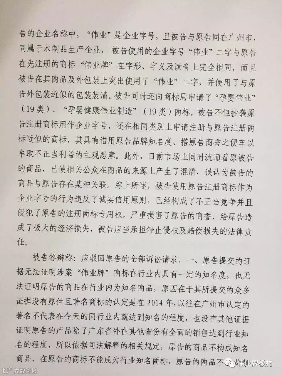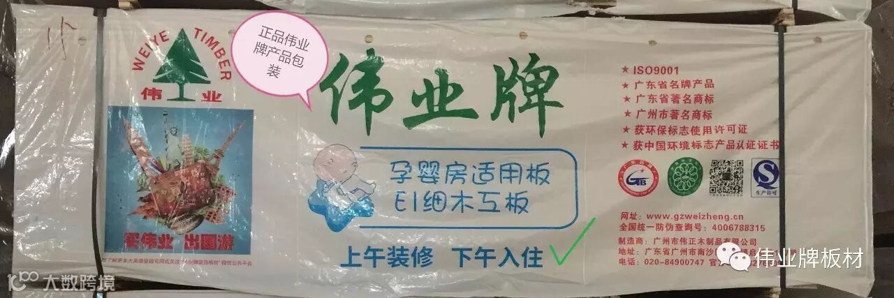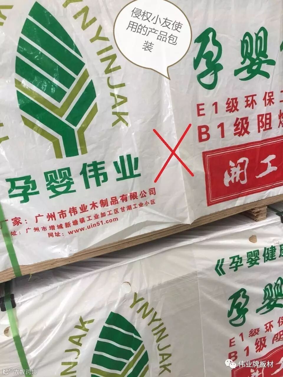 而这次,侵权的小友叫“广州市伟业木制品有限公司”,该企业成立于2015年4月28日,从企业注册名字(广州市伟业木制品有限公司)、产品名字(孕婴伟业)和产品包装(见下图)都是冲着模仿我司的产品“伟业牌”孕婴房适用板来的,目的就是混淆消费者视线,用虚假伪劣产品以次充好,获取利益。