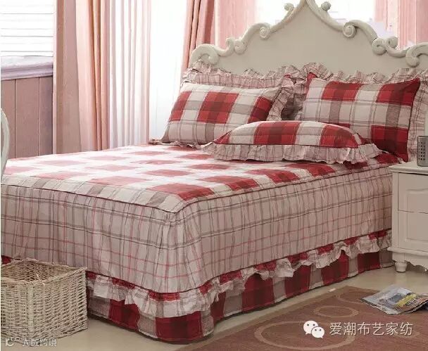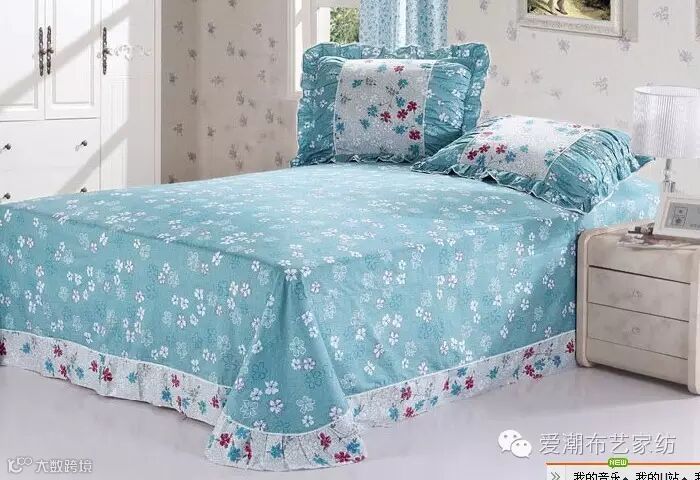 三、床罩:也有叫床裙的。这个对尺寸要求很高,一定要按照自家的床来买。床罩面是1.5米或1.8米,然后两边有45cm的裙帏。大部分的床罩里面有床笠,可以固定在席梦思上。还有一种蕾丝的床罩三面会打很多褶。床罩一般都会比其他贵。
