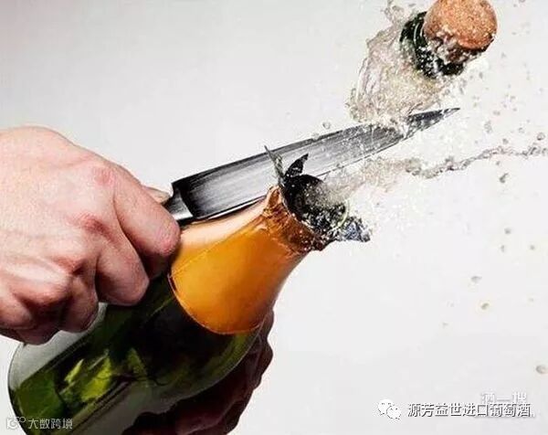 用传统法(Traditional Method)酿制的起泡酒还可使用刀削瓶口的方式开瓶;而普罗塞克(Prosecco)或阿斯蒂(Asti)等采用罐中发酵法(Tank Method)酿制的起泡酒因瓶中气压较小,瓶口无法被削开。用香槟刀开瓶的步骤如下: