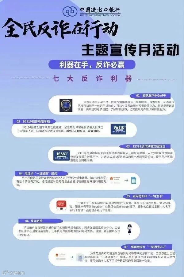 下一步,进出口银行浙江省分行将持续当好《反电信诈骗法》的“宣讲员”,夯实金融机构主体责任,不断增强市民群众抵制诈骗的“免疫力”,构筑全民反诈的“防火墙”,切实守护好百姓的“钱袋子”。