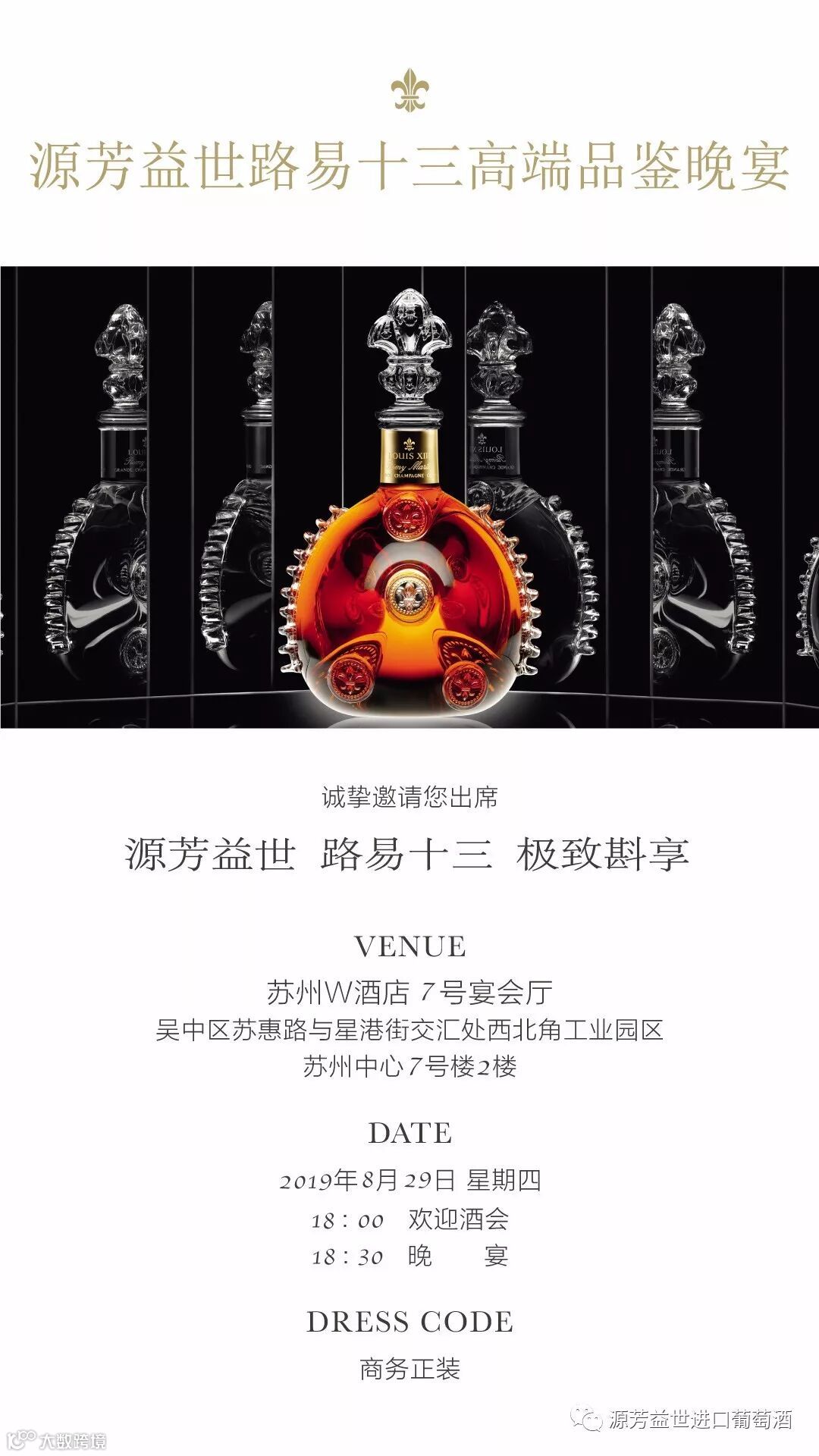 由源芳益世与人头马主办的路易十三高端品鉴晚宴将在2019年8月29号开宴,期待您的到来。