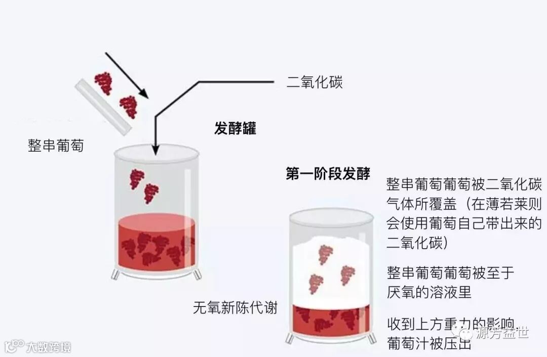 二氧化碳浸渍法是一种独特的红葡萄酒酿造工艺,它与传统的借助酵母来完成发酵的方式不一样。一般情况下,葡萄汁的发酵需要酵母的作用,而二氧化碳浸渍法则不需要酵母的参与,操作方式是将整串葡萄放入发酵罐中,注入二氧化碳后密封。在这种环境下,葡萄会进行无氧代谢,释放出自身所含的酶,将糖分转化为酒精。这个过程被称为果内发酵(Intracellular Fermentation)。当酒精度到达2%时,果皮会破裂,并释放出汁液。