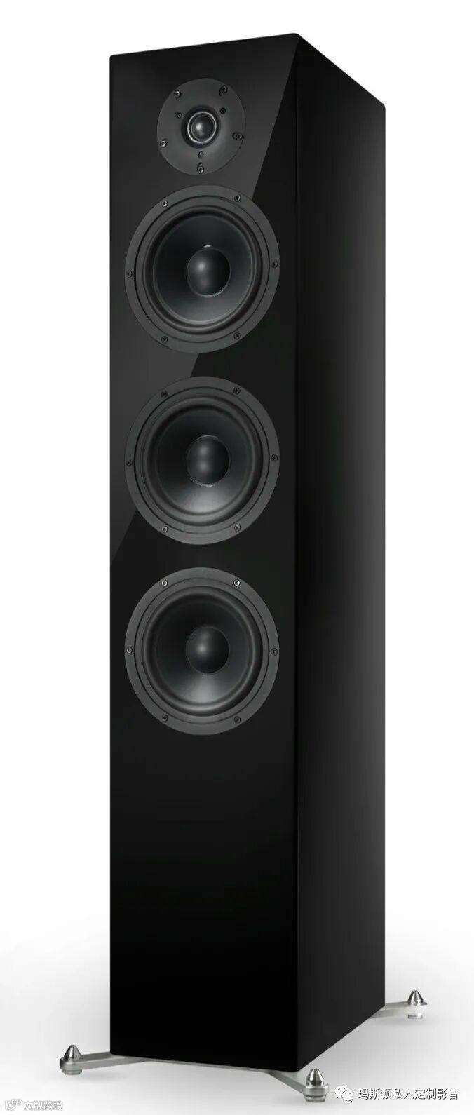 此次介绍的 A 系列采三音路设计,高度达到113公分高,体积颇为高大。单体设计方面,主箱采用了一颗球顶高音,嵌在音箱的上方正中央,外罩则采用全新的内嵌吸铁石吸附,看起来就像是与音箱合为一体。这颗型号为A- 7000的球顶高音,使用了蚕丝膜直接车制而成,前端的相位锥也经过全新设计。中音单体尺寸为185mm,采用纸质振膜,音圈采双层绕制,提供单体更好的驱动力,外圈则使用反应更加灵敏的短行程悬边。在低音部分,采用了拥有控制力佳的双磁铁系统,以及加快单体反应速度的内凹式半圆悬边设计,再加上以玻璃纤维、铝盆结合而成的振膜材质,让这颗单体同时拥有轻量与高刚特性。底座方面是搭配铝合金脚锥或橡胶脚锥,以利不同空间地板材质应用,提升对空间声响的适应能力。