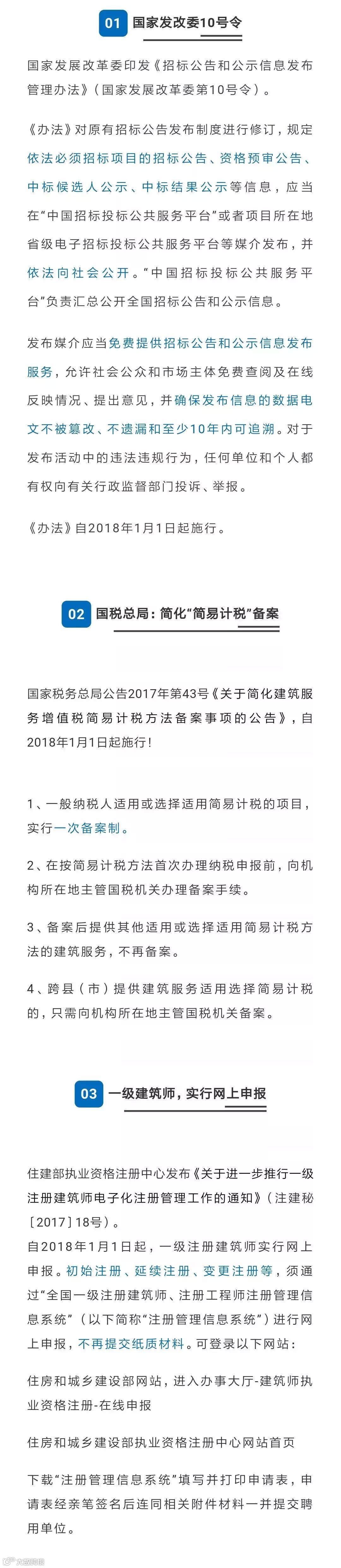国家发展改革委、住房城乡建设部、工业和信息化部等九部委联合印发:标准设备采购招标文件(2017年版)、标准材料采购招标文件、标准勘察招标文件(2017年版)、标准设计招标文件(2017年版)、标准监理招标文件(2017年版)等五个标准招标文件,要求《标准文件》自2018年1月1日起实施。