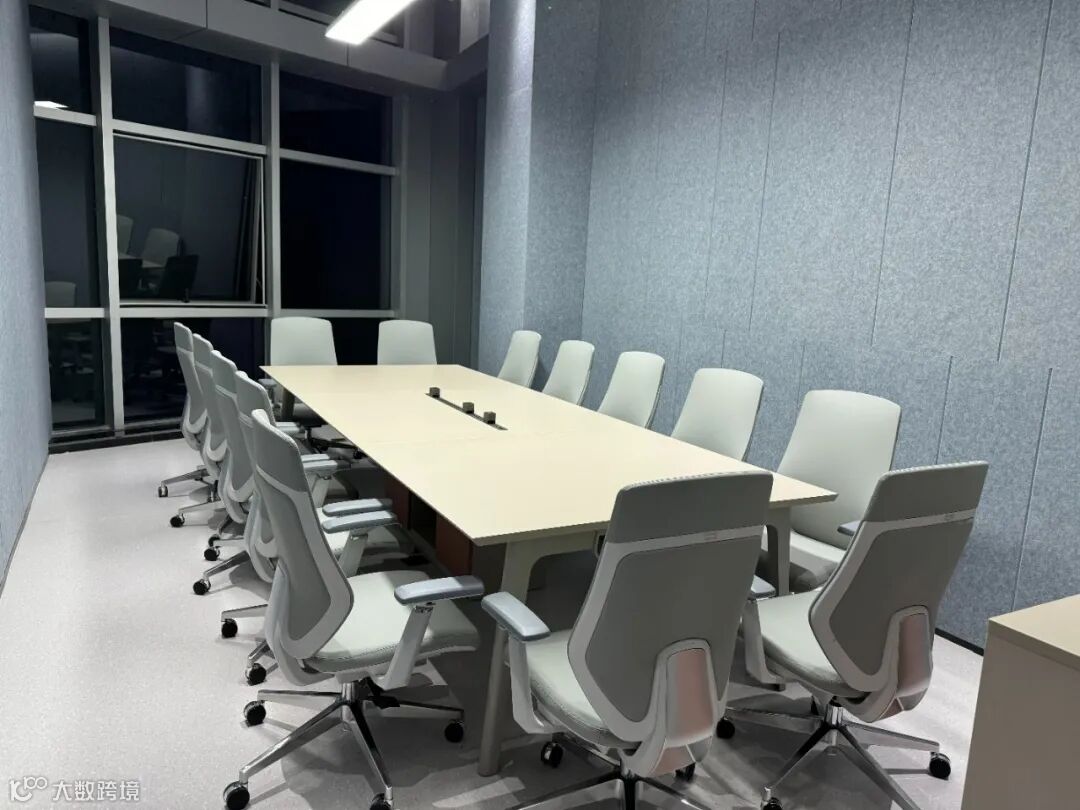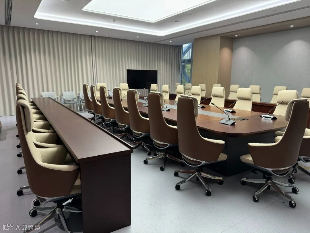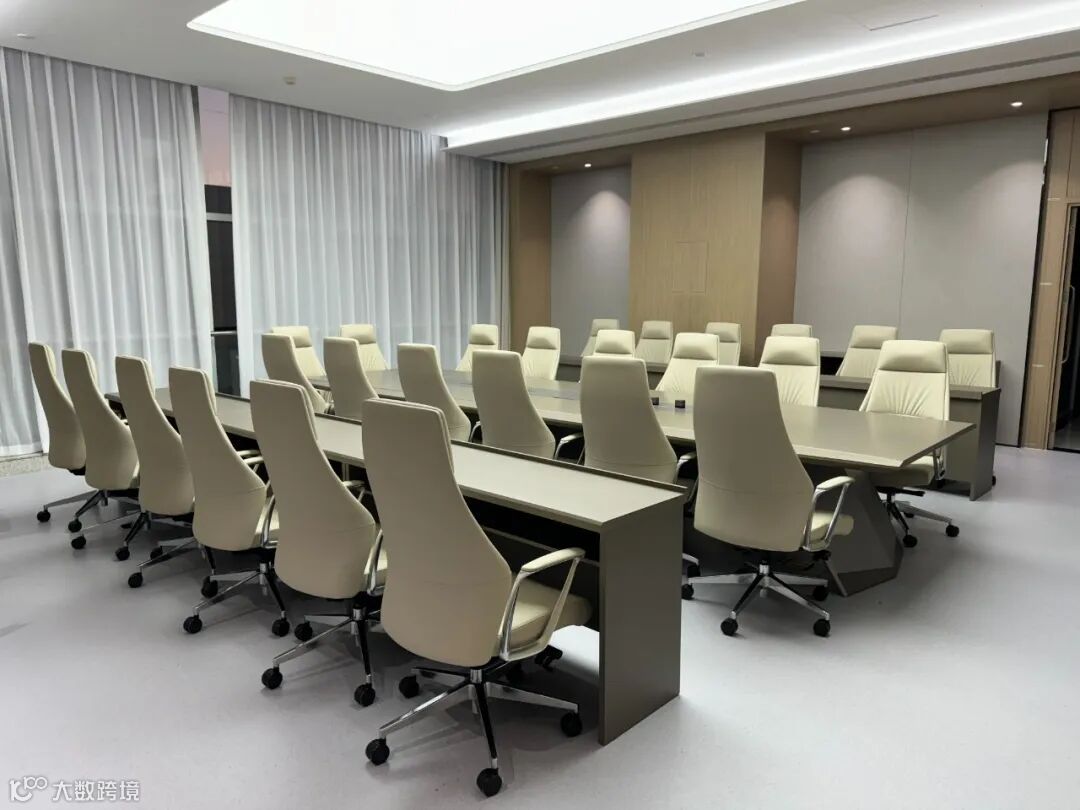 会议桌贴面材料:采用澳大利亚珍稀的直纹胡桃木本色为基色,配上实色星空灰,纹理精致清晰,四周圆弧状,彰显独特的奢华气场。同时会议桌我们也融入了"无线"办公的理念,一切走线都被巧妙隐藏,整体更加美观,先进。会议椅使用米+咖两种配色,与会议桌颜色更加相配。意大利进口牛皮、抛光铝合金五星脚和韩国HSH气杆,更是为这把椅子增添了匠心工艺和质感