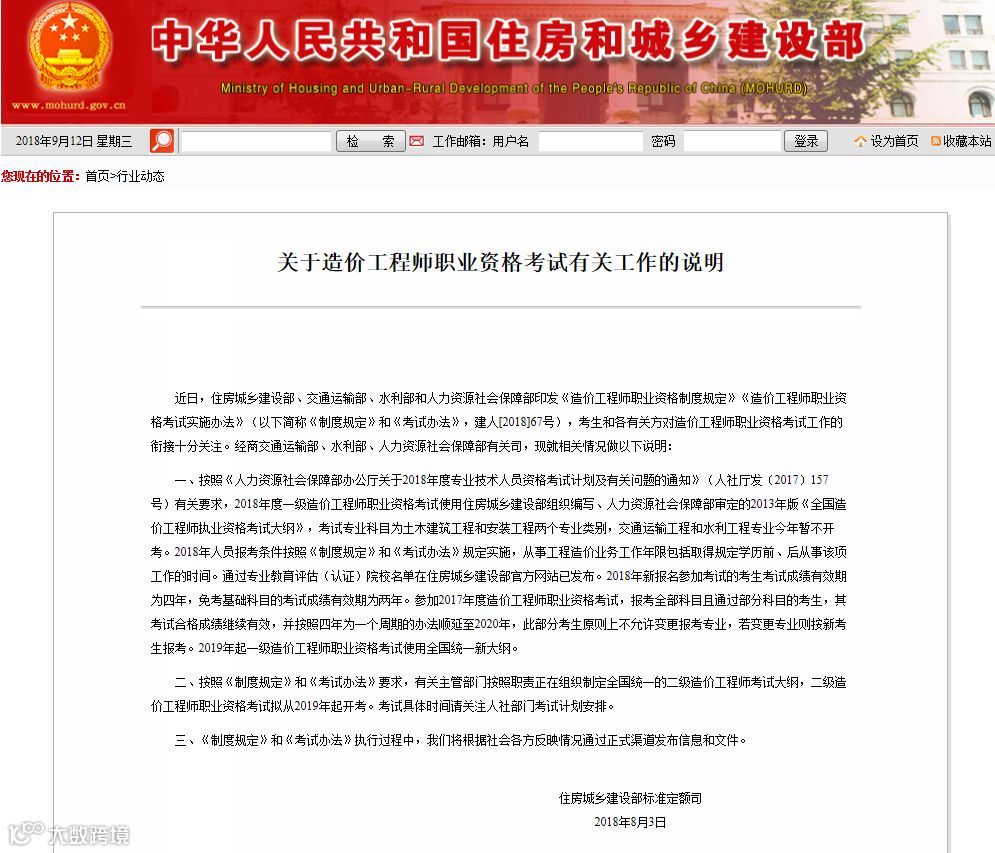 近日,住房城乡建设部、交通运输部、水利部和人力资源社会保障部印发《造价工程师职业资格制度规定》《造价工程师职业资格考试实施办法》(以下简称《制度规定》和《考试办法》,建人[2018]67号),考生和各有关方对造价工程师职业资格考试工作的衔接十分关注。经商交通运输部、水利部、人力资源社会保障部有关司,现就相关情况做以下说明: