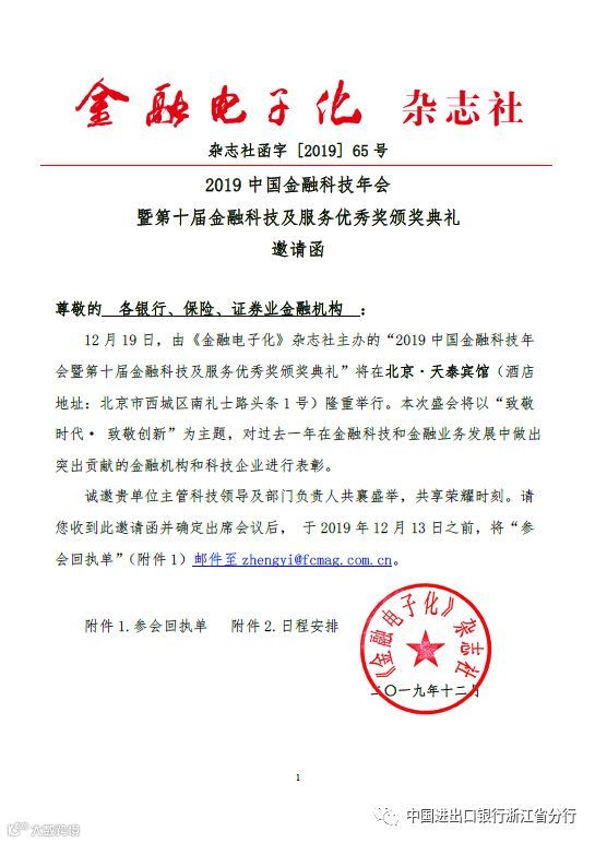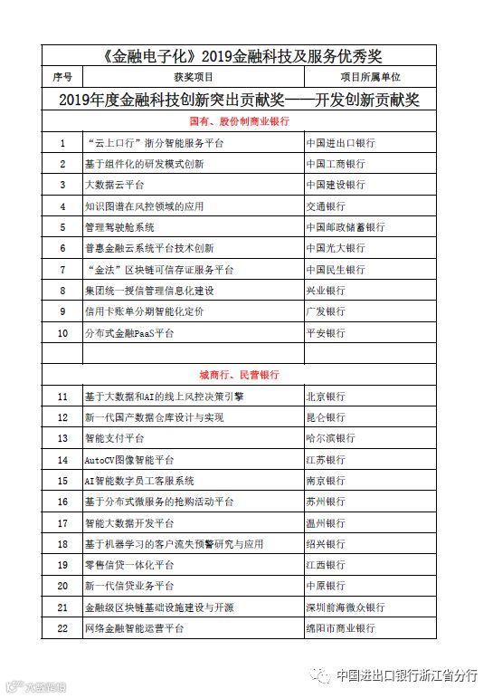 中国进出口银行浙江省分行近日,我行申报的“云上口行”智能服务平台荣获中国人民银行主管的《金融电子化》杂志社颁发的“2019年度金融科技创新突出贡献奖——开发创新贡献奖”。