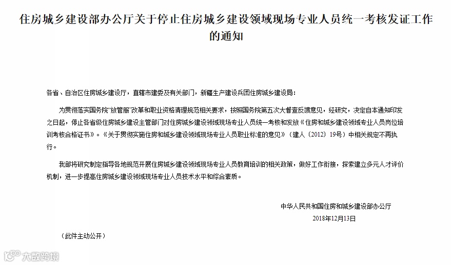 为贯彻落实国务院“放管服”改革和职业资格清理规范相关要求,按照国务院第五次大督查反馈意见,经研究,决定自本通知印发之日起,停止各省级住房城乡建设主管部门对住房城乡建设领域现场专业人员统一考核和发放《住房和城乡建设领域专业人员岗位培训考核合格证书》。《关于贯彻实施住房和城乡建设领域现场专业人员职业标准的意见》(建人﹝2012﹞19号)中相关规定不再执行。