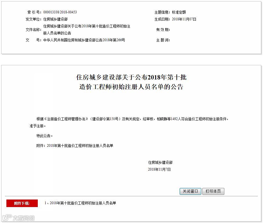 住房城乡建设部于2018年11月14日公布了关于2018年第十批造价工程师初始注册人员名单的公告,经审核,柏晓静等1492人符合造价工程师初始注册条件,准予注册。