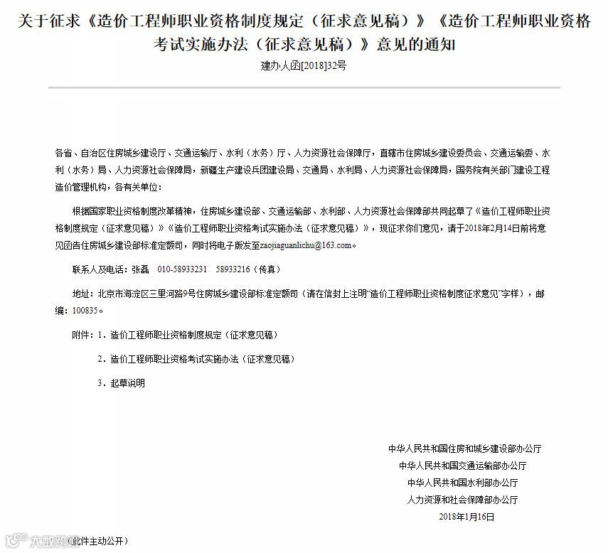 关于造价工程师职业资格制度也在不断地完善,住建部于2018年1月16日印发《造价工程师职业资格制度规定(征求意见稿)》、《造价工程师职业资格考试实施办法(征求意见稿)》。