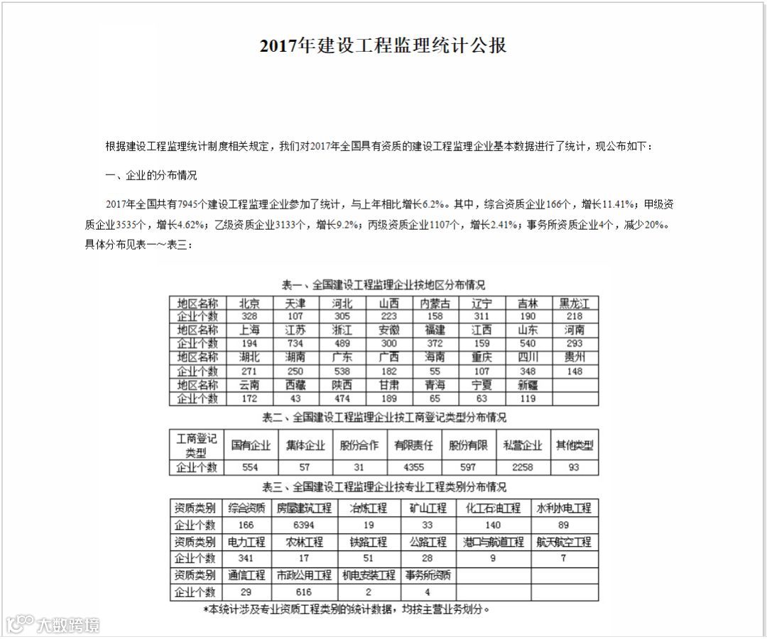 根据建设工程监理统计制度相关规定,我们对2017年全国具有资质的建设工程监理企业基本数据进行了统计,现公布如下: