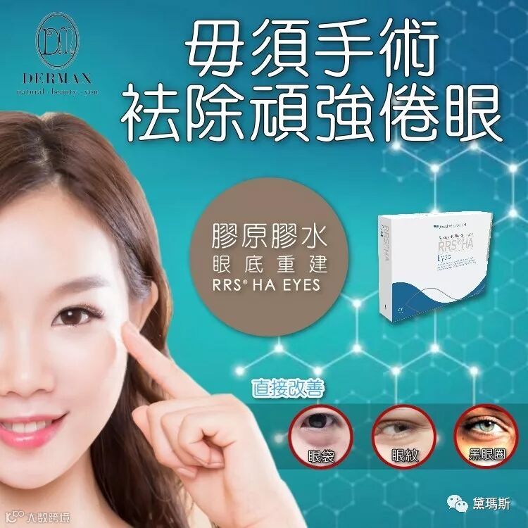 Aesthetic Dermal最新推出的RRS膠原膠水眼底重建,幫你祛除黑眼圈、眼袋、 眼紋及眼皮下垂等眼周問題。不但獲ISO9001及CE認證,更榮獲8500 位醫生選為最佳眼部重塑產品。想重現明眸雙眼?