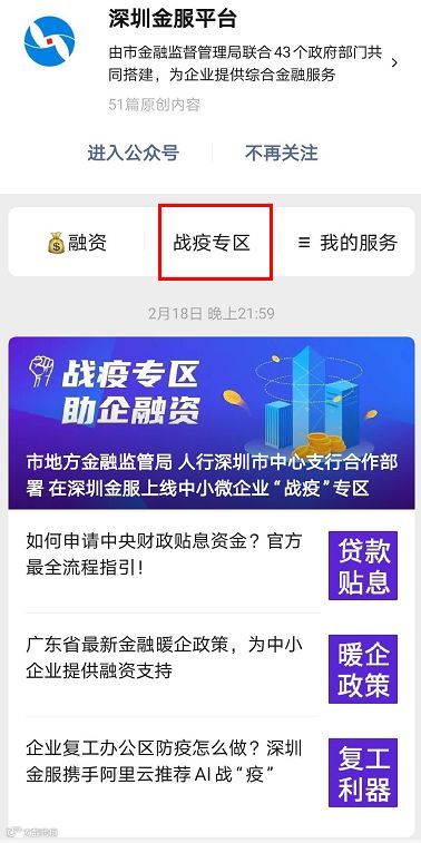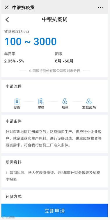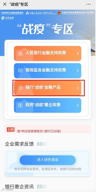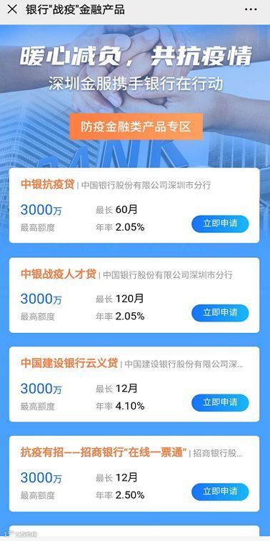 企业或通过“i深圳”APP,点击“企业服务专区-金融服务-深圳金服”页面,找到“战疫专区”专栏,点击进入首页,选择银行“战疫”金融产品选择合适贷款产品,立即申请即可。