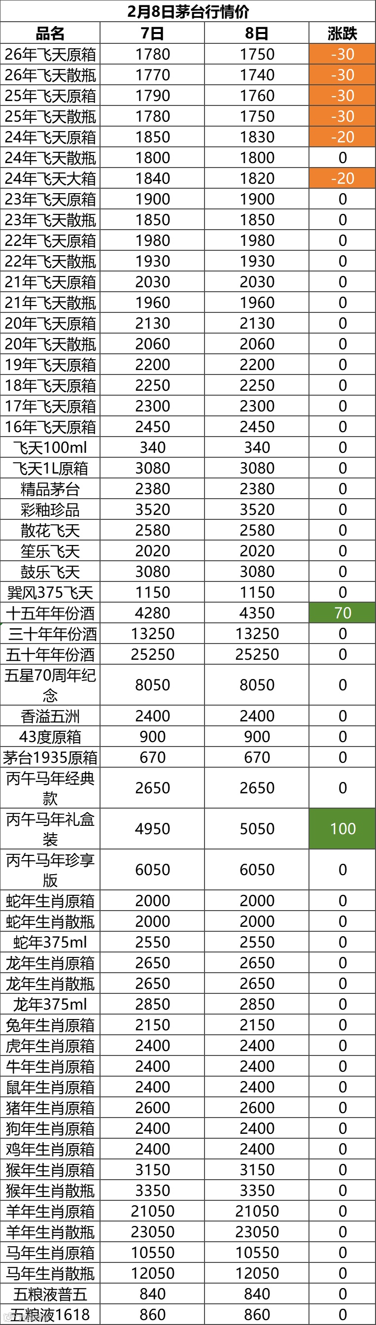 今日(2月8日),从网络上发布的白酒价格行情监测显示,今天茅台飞天的价格继昨日大涨后有了微幅下调的盘整行情。依照市场调研的价格行情数据,整理酒类行货价格成下表给大家参考。以下所有酒类商品报价,均为酒商量大的调货价,不同地区因应物流运输、仓储跟同行利润,所以有个几十块钱的差异属于正常现象。