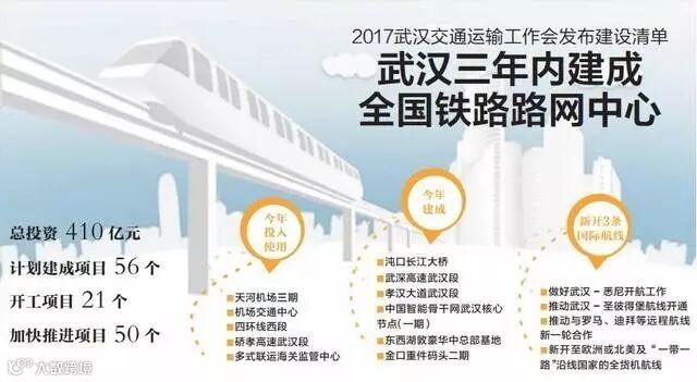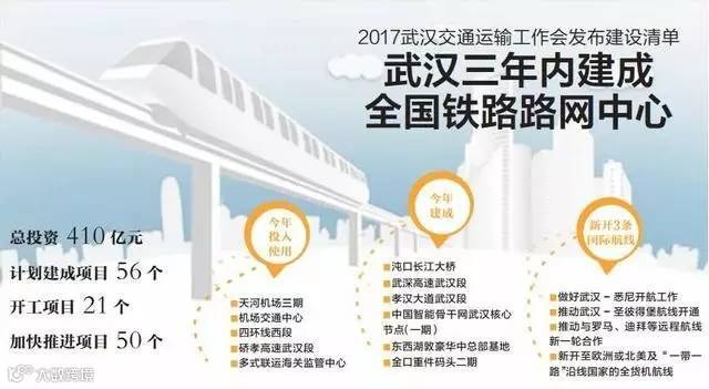 近日,2017年武汉交通运输工作会议透露,今年武汉市将完成交通基础设施建设投资410亿元,计划建成项目56个、开工项目21个、加快推进项目50个,加快建设国际性综合交通枢纽。