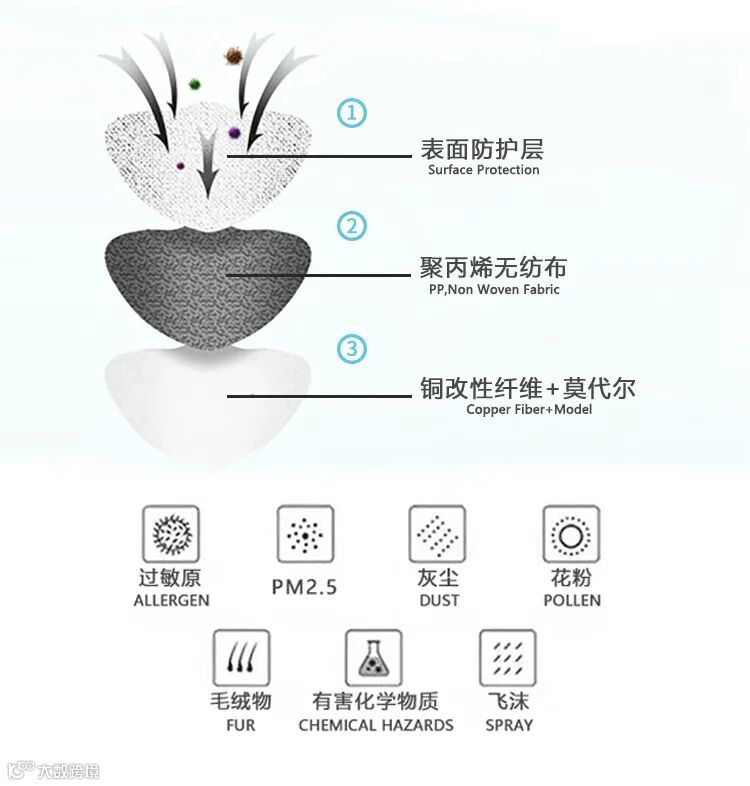 玛拉贝卡防护口罩采用三层高效过滤层,过滤层含抗菌纤维(铜改纤维),具有阻断传播,消除异味,修复皮肤,达到抗菌效果!