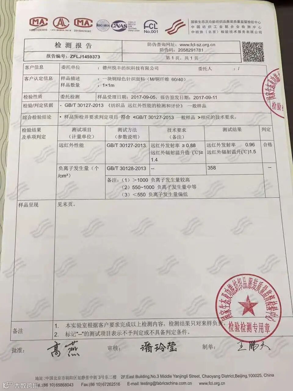 国家权威机构对铜改性聚酯纤维的测试,铜改性聚酯纤维对金黄色葡萄球菌、白色念珠菌、大肠杆菌、肺炎杆菌的抗菌指标检测,其抑菌率为99%,抑菌效果显著。达到国家纺织行业最高的AAA级标准,铜改性聚酯纤维具有强力且持久地抗菌、消臭、自洁,天然抗菌、防螨、防霉, 提高机体免疫能力,有明显的对人体保护、保健和护理作用。