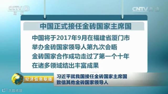 习近平指出,中国将于2017年9月在福建省厦门市举办金砖国家领导人第九次会晤。在各成员国共同努力下,金砖国家合作成功走过了第一个十年,在政治、经济、人文等诸多领域结出丰富成果。领导人会晤进程不断迈出新步伐,为金砖国家合作注入新的动力。金砖国家堪称新兴市场国家和发展中国家合作的典范,为各成员国人民带来福祉,为促进世界经济增长、完善全球治理、推动国际关系民主化作出重要贡献。