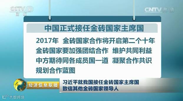 习近平强调,2017年,金砖国家合作将开启第二个十年。展望未来,金砖国家合作将取得更大发展,也将在国际事务中发挥更大作用。当前,全球挑战突出,国际形势中不确定、不稳定因素增加,金砖国家要加强团结合作,维护共同利益。作为2017年金砖国家主席国,中方期待同各成员国一道,围绕“深化金砖伙伴关系,开辟更加光明未来”的主题,凝聚合作共识,规划合作蓝图。