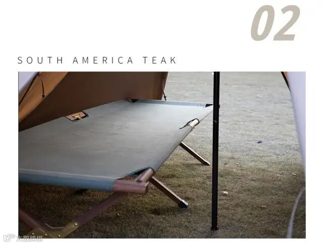 采用南美柚木木材,折叠收纳方便快捷,很受营地和露营爱好者的喜爱。床面采用20安帆布,密度高透气性强,长期使用不变色;交叉性支撑设计,不仅牢固且更大程度发挥床的稳定性。
