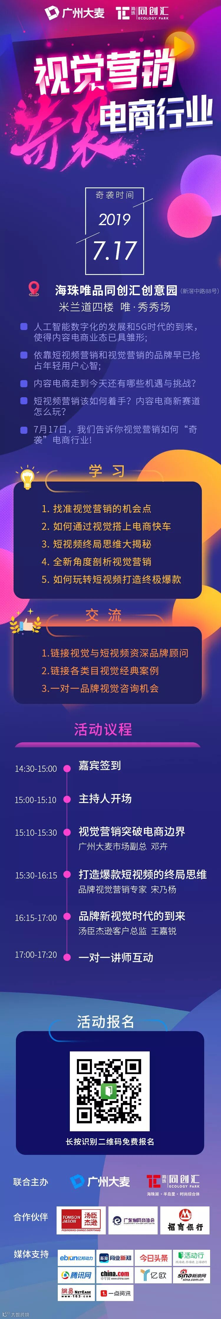 为了能让园区客户更好地在新环境新行情下快速发展,7月17日,海珠唯品同创汇牵手广州大麦及招商银行,在海珠唯品同创汇米兰道4楼唯·秀秀场#视觉营销奇袭电商行业#主题宣讲会即将隆重开启。本次宣讲会将会教你如何找准视觉营销的机会点,短视频如何打造终极爆款产品,用导演的思维剖析视觉营销为品牌销量打call!