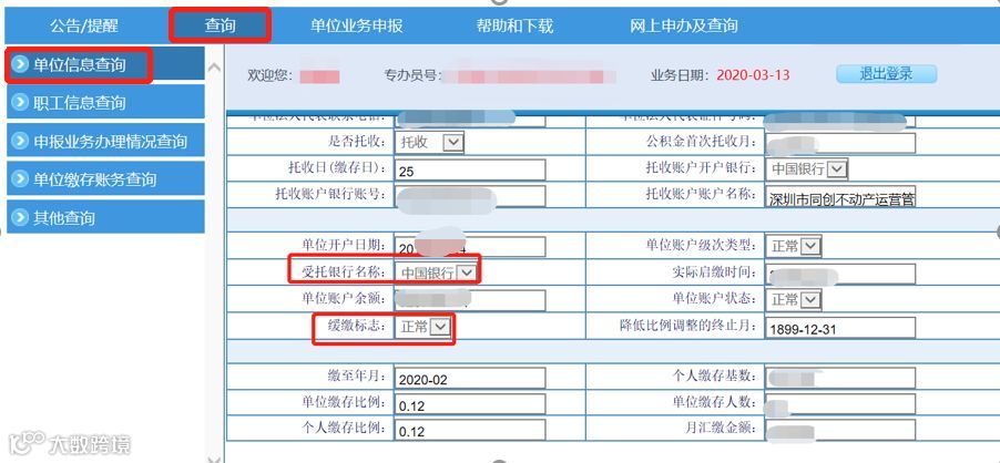 可以通过登录单位公积金单位系统-查询-单位信息查询获得,如下图,受托银行名称即可接受单位社保缓缴或降比例的,可预约对应银行的就近网点。