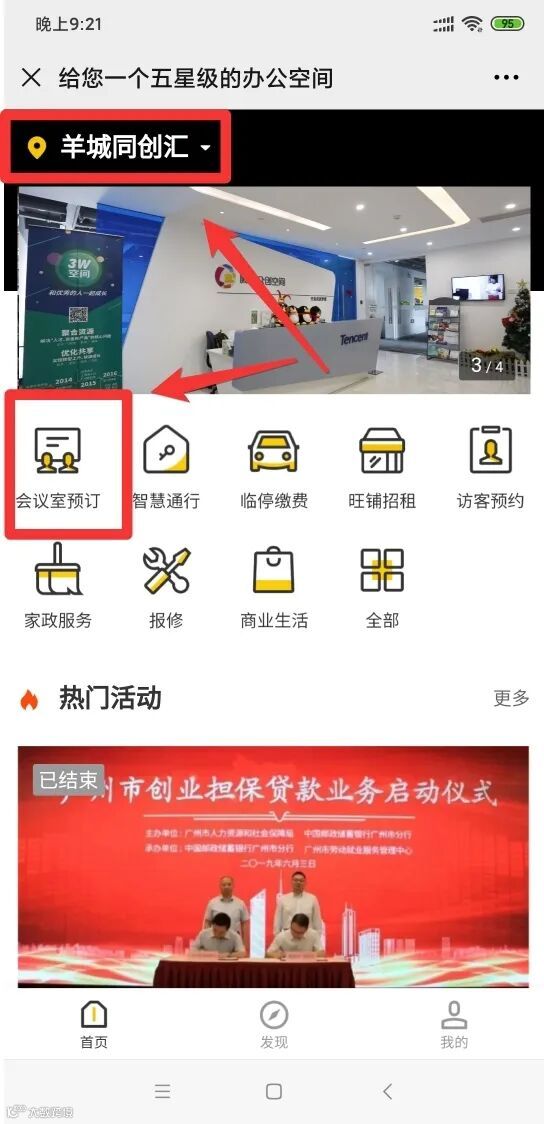 关注“同创荟”平台,点击“同创荟”,进入之后选择“羊城同创汇”,选定园区后再点击“会议室预订”即可预订会议室(见下图)。