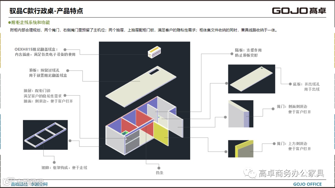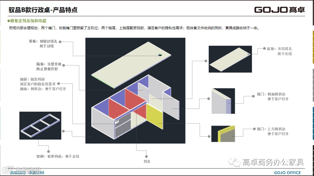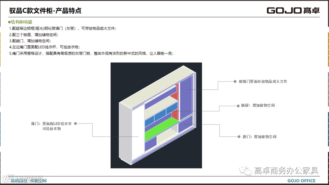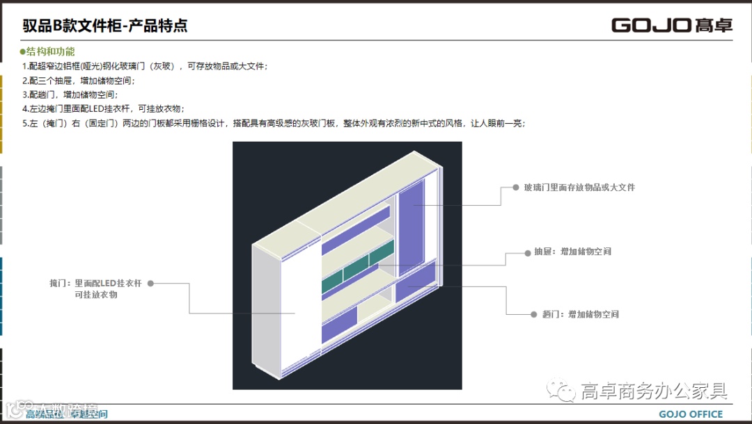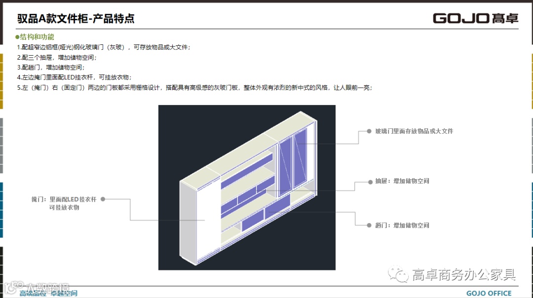 GOJO高卓品牌定位中高档次消费群体。设计主线以稳重现代类的商务风格为主,配合灵动时尚的色彩搭配为辅。设计高端现代商务办公空间、产品一站式供应的专业服务商