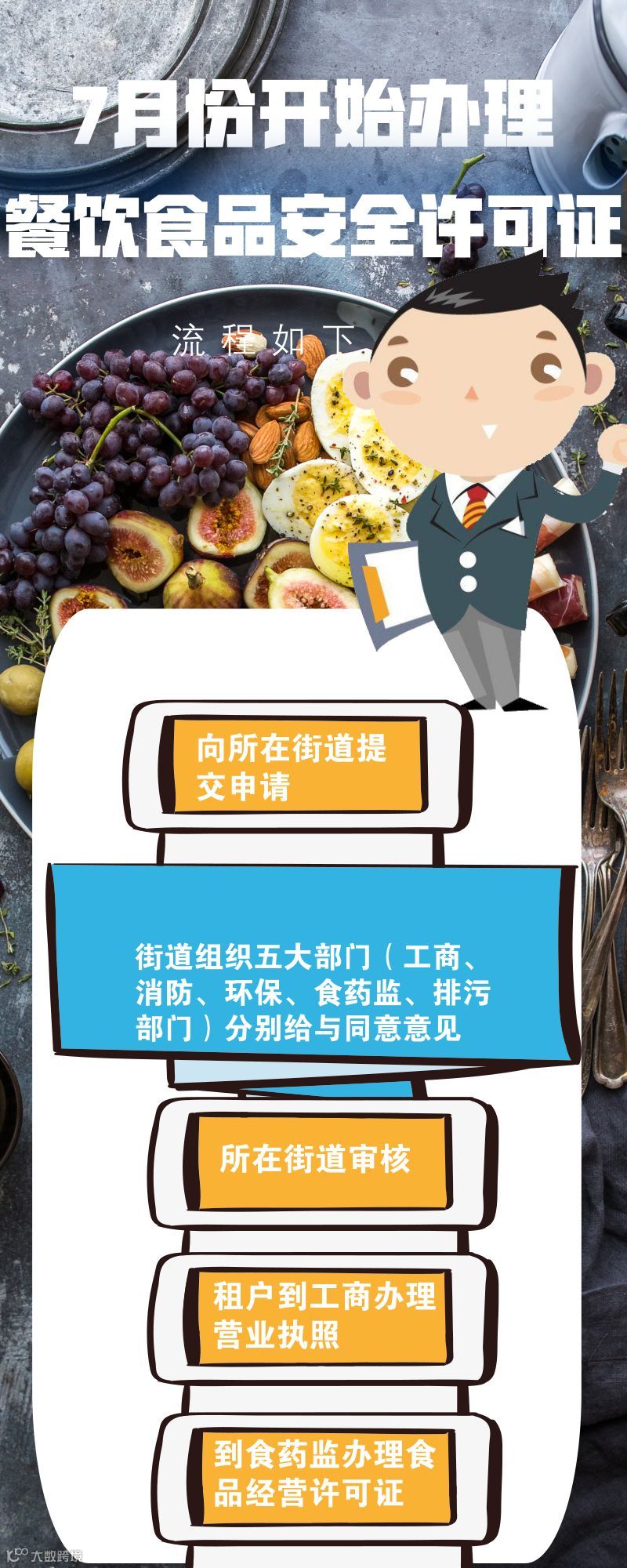 另外,在培训当中指出,7月份开始办理餐饮食品安全许可证的新流程如下:租户向工商部门办理执照前,需向所在街道提交申请,由街道组织五大部门(工商、消防、环保、食药监、排污部门)分别给与同意意见后,街道做审核,租户方可到工商办理营业执照,最后才能到食药监办理食品经营许可证。