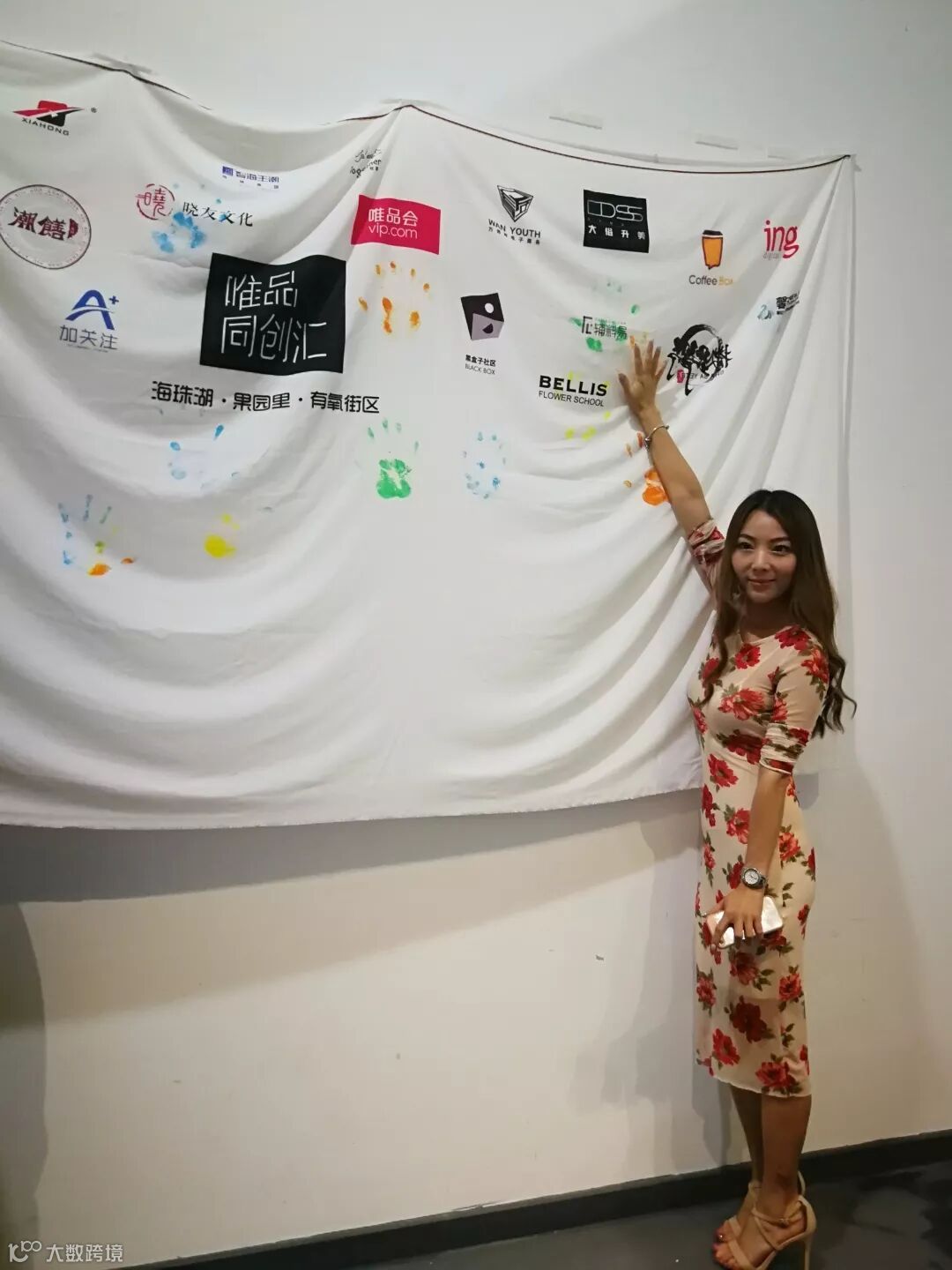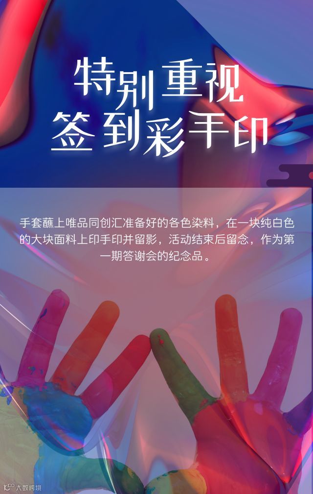 这场小巧而精致的酒会以我们脑洞大开、突发奇想的“彩手印签到”开始,来宾手套蘸上唯品同创汇准备好的各色染料,在背景墙前印上手印并留影,红毯仪式十足。