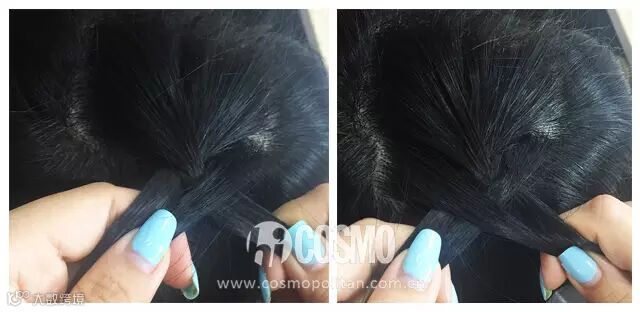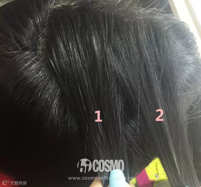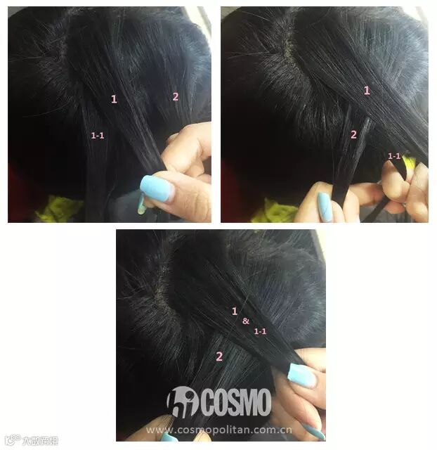 2/ 把第一份上下分成1和1-1,然后把第二份头发穿到1和1-1之间,如图所示。