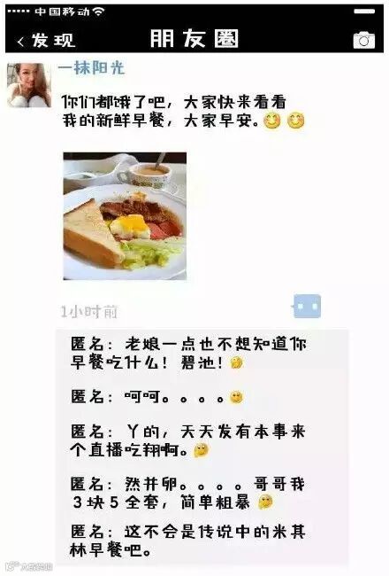 导读:如果朋友圈可以匿名评论……这画面太美不敢看……吓得我都不敢晒风景了!要是朋友圈可以匿名,那晒自拍,美食的,估