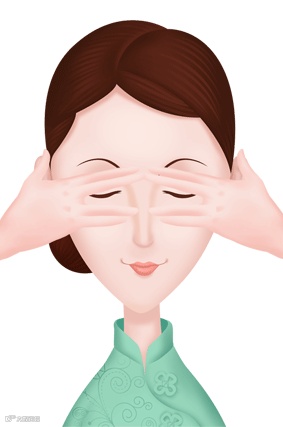 5、用中指和无名指轻轻按压睛明穴、承泣穴、瞳子髎,到太阳穴处。重复三次。