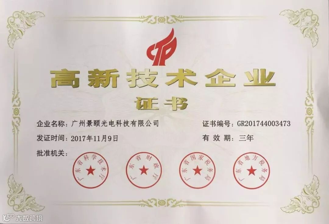 2018年春景颐光电科技有限公司喜迎佳音——根据国家《高新技术企业认定管理办法》和《高新技术企业认定管理工作指引》的相关规定,景颐光电被认定为国家级高新技术企业。近日,公司也已收到了由广东省科学技术厅、广东省财政厅、广东省国家税务局、广东省地方税务局联合颁发的“高新技术企业”认定证书,由此正式迈入国家高新技术企业行列。