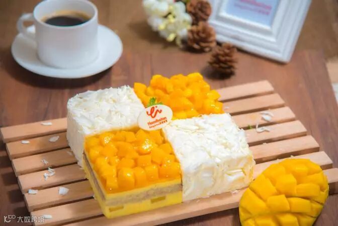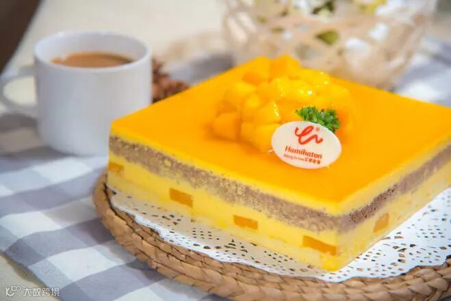 配料:原味蛋糕、芝士、芒果果馅、芒果淋面