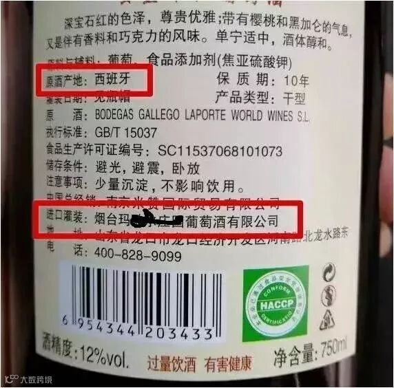 没有中文背标的葡萄酒,有可能是走私过来的,或者是进口商没贴,并不能判断进口方式。如果中文背标上有标示灌装地,那这类酒是“原酒进口”的概率比较大,因为原瓶原装一般不标示灌装地。这是淘宝上搜到的原汁进口国内灌装的酒的背标,要同时注明“原酒产地”和“进口灌装”两项: