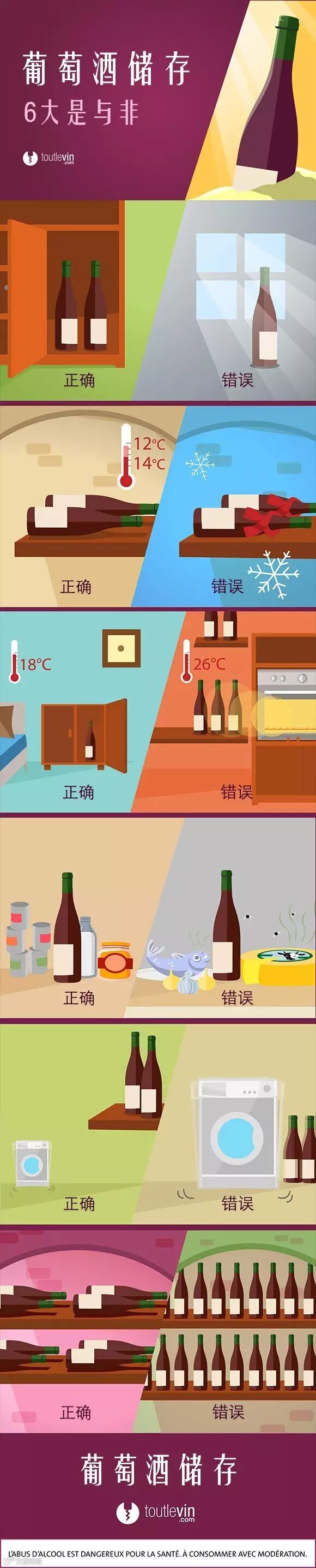 众所周知,最优质的葡萄酒能够历经时间的考验,即使藏于瓶中,也能生生不息,继续发展。但是,假若储存条件稍有不当,美酒的状态就会急转直下,沦为残次品。因此,优质的酒也需要细致入微的储存条件,才能得到升华。下面这张图以直观的方式,教会你葡萄酒储存中的对与错。