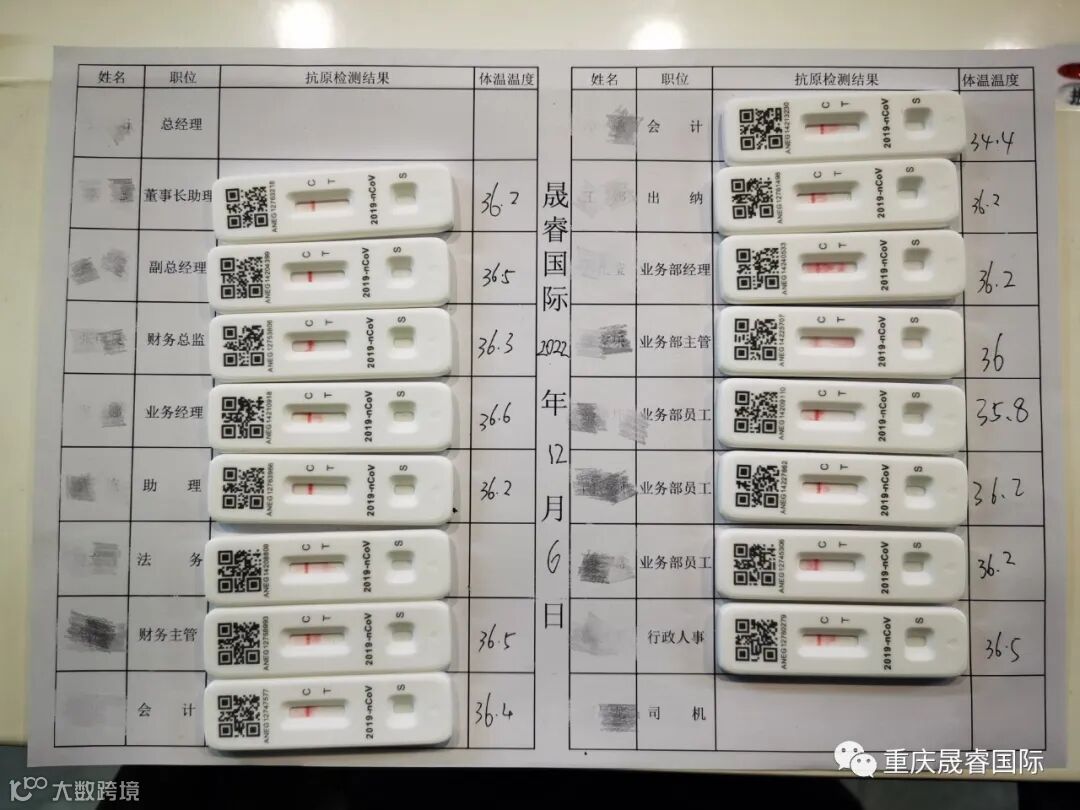 重庆晟睿国际为更好的保护各位同仁的身体健康,减少不必要的风险,提前备好了抗原检测卡,每日实时检测,及时防控。